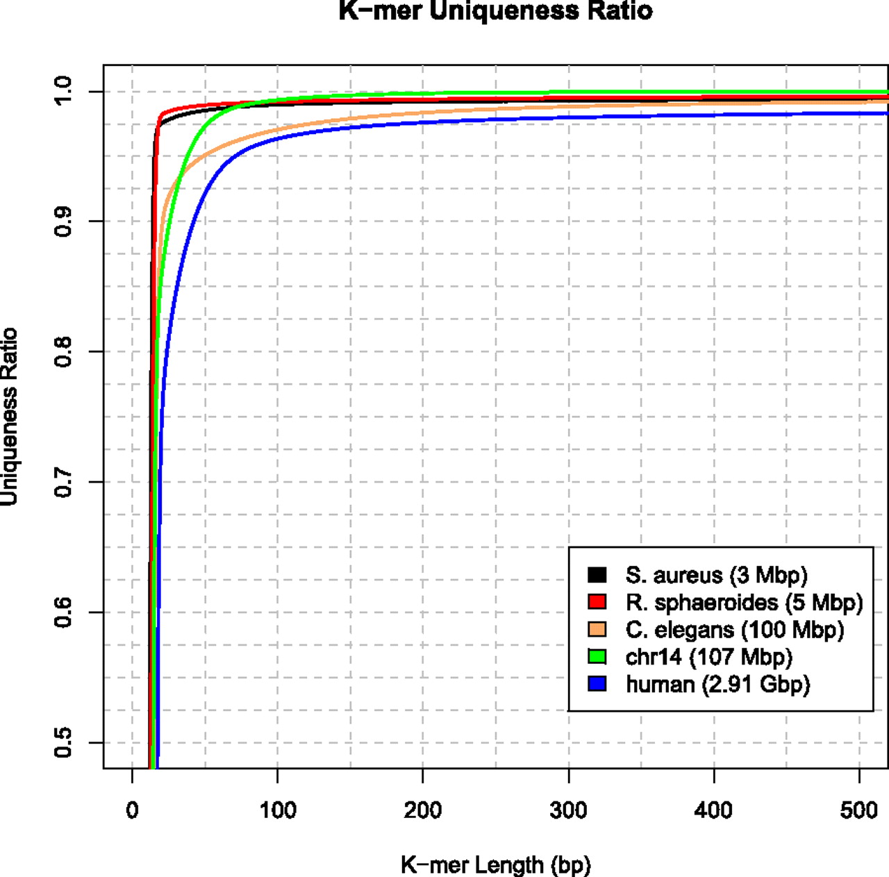 K-mer uniqueness ratio for the three genomes assembled in GAGE: the bacteria S. aureus and R. sphaeroides and human chromosome 14. The ratio is defined as the percentage of a genome that is covered by unique (i.e., non-repetitive) DNA sequences of length K. Shown for comparison are the k-mer uniqueness ratios for the full human genome and for the nematode C. elegans.