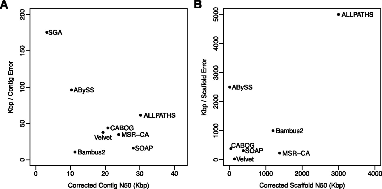 Average contig (A) and scaffold (B) sizes, measured by N50 values, versus error rates, averaged over all three genomes for which the true assembly is known: S. aureus, R. sphaeroides, and human chromosome 14. Errors (vertical axis) are measured as the average distance between errors, in kilobases. N50 values represent the size N at which 50% of the genome is contained in contigs/scaffolds of length N or larger. In both plots, the best assemblers appear in the upper right.