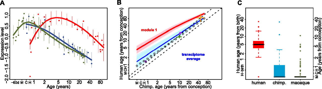 Time-shift in expression of module 1 genes among species. (A) Module 1 gene expression including the fetal rhesus macaque samples. Points indicate individuals (red, human; blue, chimpanzee; green, macaque), lines show cubic spline curves. (Error bars) SD across genes in a module. (B) Difference in developmental timing between humans and chimpanzees for PFC module 1 genes (red) and for all age-related genes in the PFC (transcriptome average; blue). The x- and y-axes show human and chimpanzee age in years from estimated conception event. H, C, and M axis marks show the time of birth for human, chimpanzee, and macaque, respectively. The curves show at what age human expression levels correspond to those of chimpanzee, estimated by aligning the chimpanzee and human expression profiles using the dynamic time warping algorithm. The light red and blue areas show variation in the module 1 time-shift estimate and the transcriptome average's time-shift estimate, respectively, obtained by bootstrapping module 1 genes or random assignments of PFC age-related genes to module 1, 1000 times. The other lines and symbols show timing of life history landmarks: Lower and upper black dashed lines show the diagonal line passing through the origin and the maximum lifespan point, respectively. Empty gray circles represent the timing of human brain growth relative to that of chimpanzees, using the dynamic time warping algorithm (data from Leigh 2004). The symbols represent the following life history landmarks: maximum lifespan (orange), female sexual maturity (green), and eruption of first deciduous and last permanent dentition (dark and light purple, respectively) (data from Smith et al. 1994; de Magalhães and Costa 2009). Note that the transcriptome average (dark blue curve) being above the diagonal indicates that humans reach the same expression levels at a later age than chimpanzees. Further, this developmental delay is significantly greater for module 1 (red curve) than for the transcriptome average. (C) The boxplot shows the distribution of ages at which expression of PFC module 1 genes reaches its maximum (red, human; blue, chimpanzee; green, macaque). The left and right y-axes show ages in years from birth for humans and from estimated conception time, respectively. H, C, and M indicate birth age for humans, chimpanzees, and macaques, respectively.