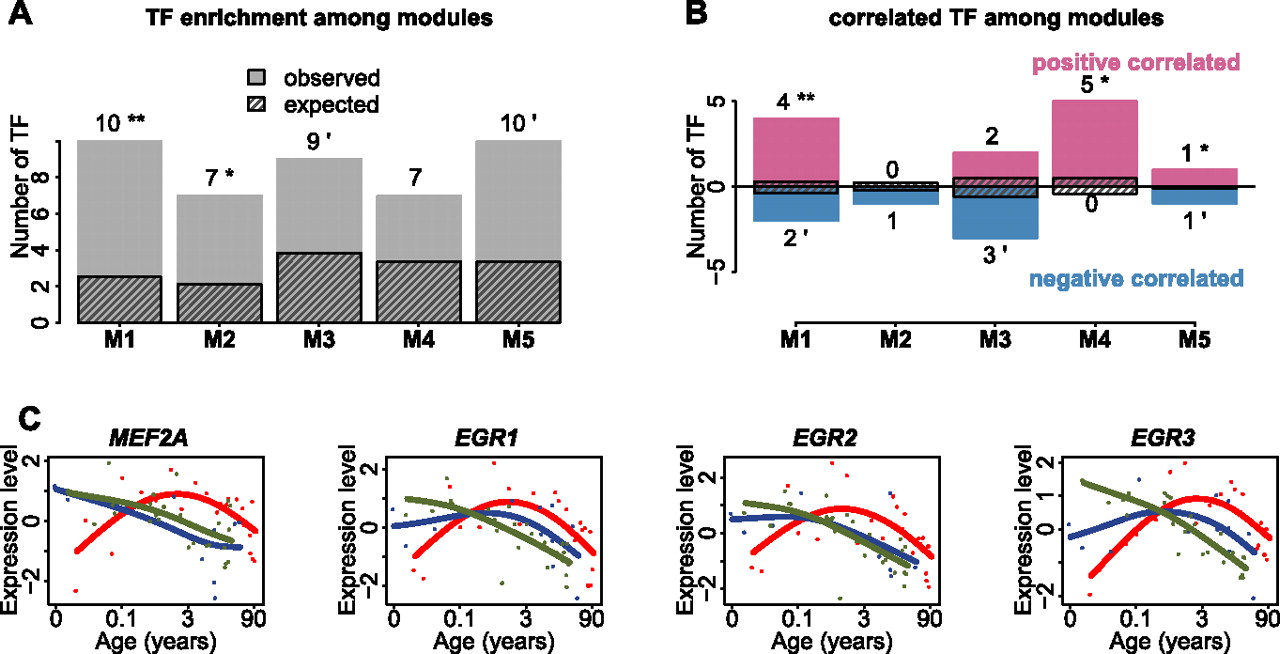 Regulation of human-specific expression patterns by TFs. (A) Number of TFs with TFBSs enriched among genes within each of the five human-specific expression modules in the PFC. The streaked bars represent the mean number of enriched TFs expected by chance, calculated by 1000 random assignments of the PFC age-related genes to the five modules. The numbers and symbols above each bar show numbers of TFs with enriched TFBSs among module genes (one-sided hypergeometric test, P < 0.05), as well as the significance of the number of TFs based on the 1000 permutations (**P < 0.01, *P < 0.05). (B) Number of TFs with TFBSs enriched and correlated with the targets in the same modules. The streaked bars represent the mean number of correlated TFs expected by chance, calculated by 1000 random assignments of the PFC age-related genes to the five modules. The numbers and symbols above each bar show numbers of correlated TFs among module genes (one-sided Wilcoxon test, P < 0.05), as well as the significance of the number of correlated TFs based on the 1000 permutations (**P < 0.01, *P < 0.05). (C) Expression profile of the four TFs showing significant positive correlation with their target gene expression profiles in all species in module 1. Points indicate individuals (red, human; blue, chimpanzee; green, macaque); lines show cubic spline curves. Note that MEF2A is a module 1 member, whereas EGR1-3 failed by a small margin to be classified as human-specific based on our criteria.