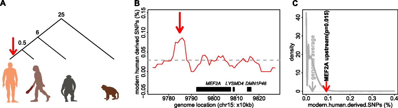 Signature of recent positive selection upstream of the MEF2A gene. (A) The phylogenetic relationship of human, Neanderthal, chimpanzee, and rhesus macaque species. (Red arrow) Human lineage. The numbers show approximate divergence time in millions of years (Kumar and Hedges 1998; Pääbo 1999; Chen and Li 2001). (B) Proportion of human-derived SNPs measured using a 50-kb sliding window in the MEF2A gene region (red). SNPs were classified as derived according to the method described by Green et al. (2010). (Gray dashed line) Genome average. (Red arrow) Location, upstream of MEF2A, with significant excess of human-derived SNPs (one-sided Fisher's exact test, P = 0.00006). (C) Distribution of the proportion of human-derived SNPs for all windows across the human genome. (Red arrow) Probability of finding the observed proportion of human-derived SNPs in the location 50–100 kb upstream of MEF2A, estimated from the genome distribution.