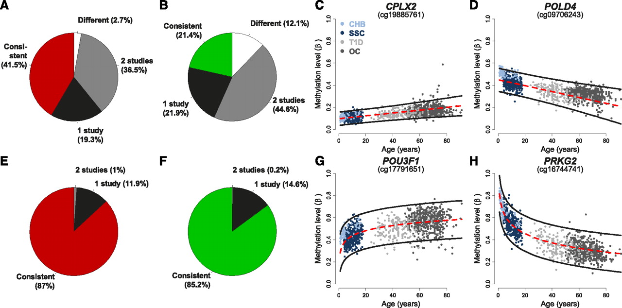 Meta-analysis of pediatric and adult populations: modeling rates of DNAm change via an interaction model. (A,B) Pie charts displaying the proportion of SSC age-methylated (A) and age-demethylated (B) loci that have significantly different rates of DNAm change from the rates found in the CHB, T1D, and OC populations (different: white); in two of these studies (gray); and in one of these studies (black). Loci with similar rates of DNAm change across all four populations are shown in red (A: age-methylated), and green (B: age-demethylated). (C,D) Representative age-methylated (C) and age-demethylated (D) loci that have a similar rate of DNAm change in all populations. (Red dashed line) The linear regression on the SSC data only; (black lines) the 95% predication interval based on this regression. All individuals are denoted by dots and their colors are described in the inset of C. Each plot is titled by the name of the gene associated with the CpG interrogated by the Illumina platform. (E,F) Pie charts similar to those in A and B but modeling the log of age. (G,H) Representative age-methylated (G) and age-demethylated (H) loci that follow a log of age (but not linear) trend in all populations.