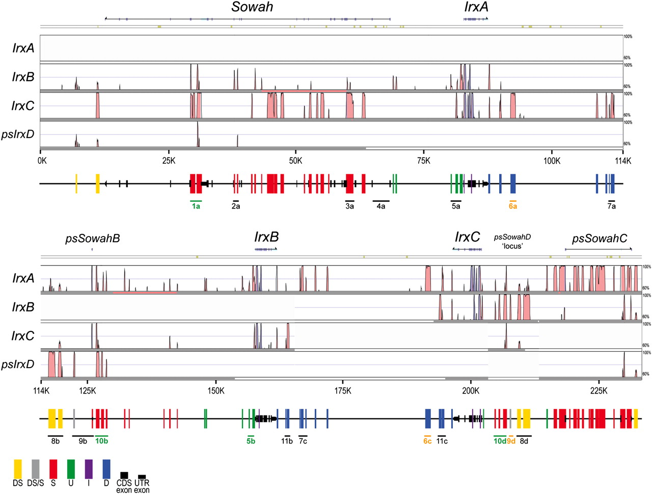 Internal organization of the Irx-Sowah complex in B. floridae. VISTA plot of the alignments between each of the three Irx genes (plus a fourth region corresponding to a putative IrxD locus lost during amphioxus evolution) and their respective surrounding noncoding regions, including Sowah in the case of IrxA. Colored peaks (blue, coding; turquoise, UTR; pink, noncoding) indicate regions of at least 100 bp and ≥70% similarity. High-copy number elements (such as repeats and mobile elements) are masked and their presence is indicated by khaki segments above the VISTA plot. Vertical bars of different colors below the VISTA plot represent the different conserved repeated blocks, indicating their respective location to Sowah and Irx loci (DS, Downstream Sowah; S, within Sowah; U, Upstream Irx; I, Introns of Irx; D, Downstream Irx. DS/S bars indicate elements of uncertain identity [DS or S]). Black rectangles and arrows indicate the exon sequences of Irx, Sowah, or the remains of Sowah duplicates. The blocks tested for transcriptional enhancer activity are indicated and named with a number and letter code. The letter refers to the Irx locus with which they are associated; color indicates whether they are tissue-specific enhancers (green), unspecific enhancers (yellow), or negative elements (black).