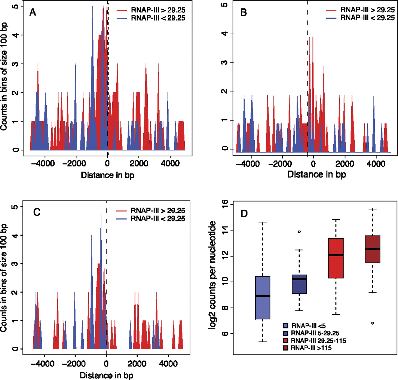 RNAP-III-occupied tRNA genes are often close to transcribed RNAP-II genes. (A) RNAP-III-occupied tRNA genes are often close to RNAP-II TSSs. The horizontal axis shows the distance separating RNAP-III and RNAP-II TSSs (0 indicates the RNAP-III TSS; negative and positive numbers indicate the regions upstream of and downstream from the TSS, respectively). The vertical axis indicates the number of tRNA genes in bins of 100 bp, separated into genes with RNAP-III occupancy scores >29.25 (red) and <29.25 (blue). (B,C) As in A, but only the RNAP-II genes transcribed in the same or opposite strand, respectively, as the tRNA gene are shown. (D) Box plots show tRNA genes with scores <5 (blue box), between 5 and 29.25 (dark blue box), between 29.26 and 115.37 (bright red box), and higher than 115.37 (dark red box). (Vertical axis) Highest number of POLR2B tags in 500-bp regions centered on an RNAP-II TSS found within 5 kb upstream of and 5 kb downstream from each tRNA gene.