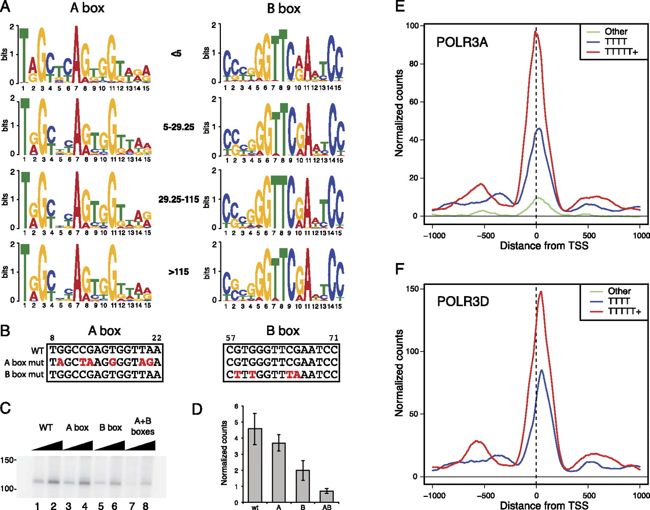 The qualities of the A and B box and terminator sequences correlate with RNAP-III occupancy. (A) The LOGOs obtained for the A and B boxes in tRNA genes with the RNAP-III scores indicated in the middle. (B) A and B box mutations introduced into the serine tRNA gene (chr11_1821_tRNASer_GCT-). Note that bases 3–6, 14, and 15 of the A box, and bases 2–6, 14, and 15 of the B box are, for most tRNAs, involved in base-pairing in the clover leaf structure. For the tRNA gene analyzed here, the bases involved in base-pairing are bases 3–5 of the A box and bases 2–6, 14, and 15 of the B box. (C) In vitro transcription with the serine tRNA gene, either wild type, or with mutations in the A, B, or both A and B boxes as indicated above the lanes. (D) Quantitation of six replicate experiments as in C. (E) Average tag density profiles for POLR3A in genes with strong terminators (5Ts or more, red line), medium terminators (4Ts, blue line), or poor terminators (less than 4Ts, green line). (F) As in E, but for POLR3D.