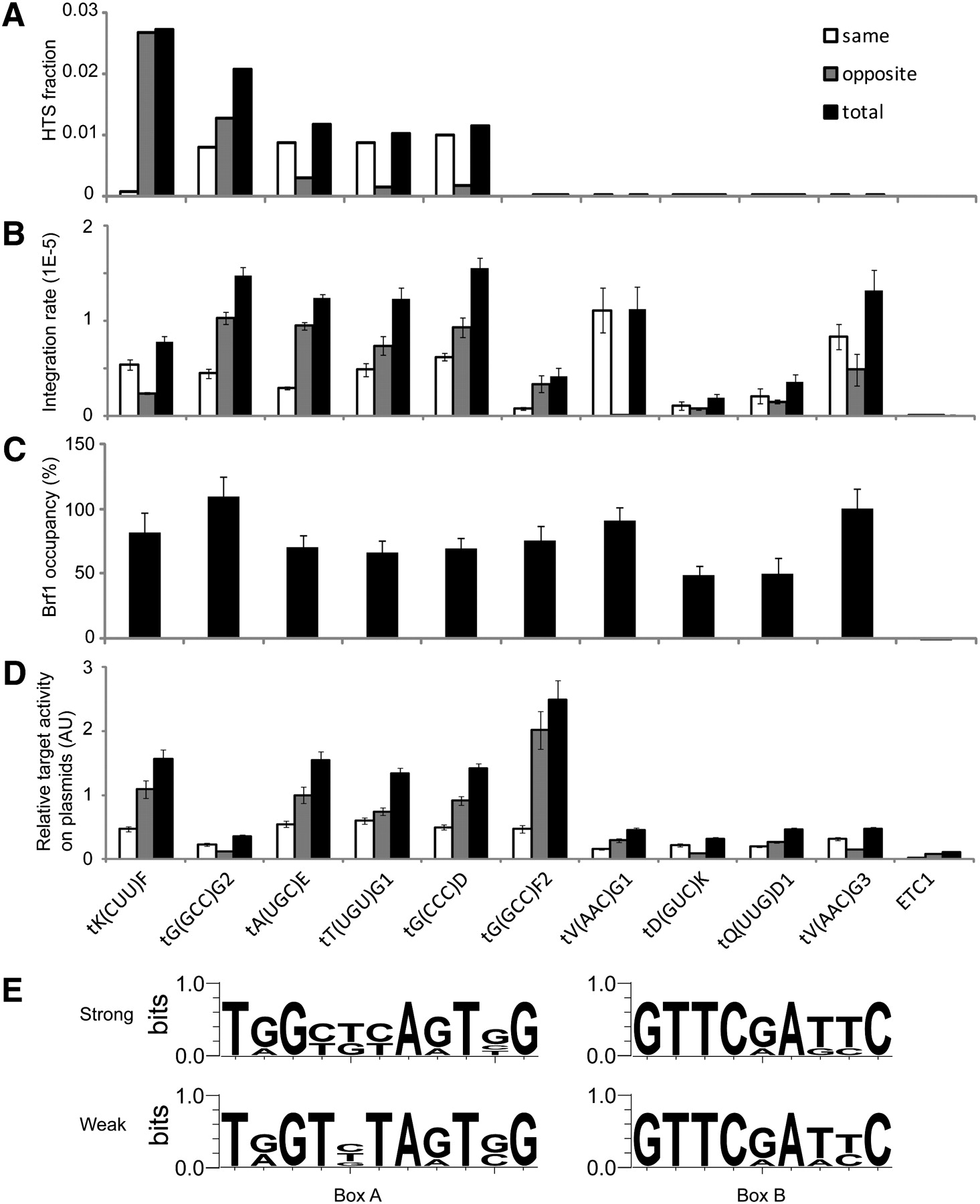Quantitative Ty3 transposition at tDNAs with high and low DNA sequencing reads. (A) Distribution of sequencing reads from five top decile tDNA clusters and five bottom decile tDNA clusters. Yeast strains YMA1322 and YMA1356 transformed with Ty3-HIS3 expression plasmid pKN3050 were induced for Ty3 expression for 24 h. Insertions into tDNA target clusters were ranked by number of reads, and example top and bottom decile genes (shown) were selected. ETC1 was not detected by sequencing and was used as a negative test case. Bars show reads in which Ty3 and target are transcribed in the same (open) and divergent (gray) orientations and the total (black) is shown. (B) YMA1322 transformed with Ty3-ppt expression plasmid pKN3097 was induced for Ty3-ppt expression as described in A, and Ty3 integrations at reporter target loci were measured using qPCR (Methods). Measurements were within the linear range as standardized using plasmid versions of the Ty3 insertions at each locus. Bars represent technical triplicates of biological duplicates. (C) TFIIIB occupancy of reporter Ty3 target loci. Yeast strain YKN1692 expressing TFIIIB subunit Brf1 tagged with 3HA and transformed with empty URA3 vector plasmid YCplac33 was grown under inducing conditions for 24 h, and Brf1 occupancy at reporter loci was measured using ChIP. ChIP values were determined relative to an ACT1 control. The fold of enrichment for tDNA reporter tV(AAC)G3 to ACT1 was 73:1. The data are expressed relative to the fold enrichment at tV(AAC)G3 set at 100%. (D) Ty3 integration frequencies at tDNA reporter loci and flanking sequence. YMA1322 transformed with Ty3-ppt plasmid pKN3097 and vector pXP622 containing reporter target loci and flanking sequence (120 bp upstream and downstream of target gene) was induced to express Ty3 for 36 h, and integrations were quantified by qPCR. Data are expressed as described in B. (E) Based on target activity (D), promoter elements in strong target loci [tK(CUU)F, tA(UGC)E, tT(UGU)G1, tG(CCC)D, and tG(GCC)F2] and weak target loci [tG(GCC)G2, tV(AAC)G1, tD(GUC)K, tQ(UUG)D1, and tV(AAC)G3] were analyzed for consensus using logo sequence analysis software (http://weblogo.berkeley.edu).
