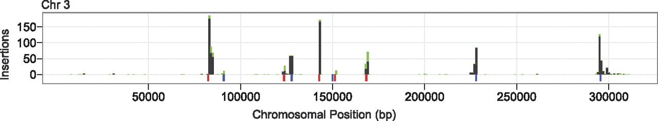Distribution of Ty1 insertions on chr 3. The x axis denotes position along the chromosome at 1 kb resolution. (Black bars) Number of unambiguous insertions at a particular site. (Stacked green bars) Ambiguous insertions. Colored bars below the x axis indicate positions of class III genes. (Blue) Genes transcribed from left to right. (Red) Genes transcribed in the opposite direction.