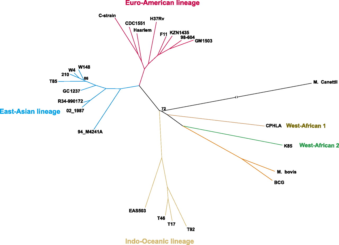 Phylogenetic tree constructed using SNPs purged of recombination tracts. The maximum likelihood tree was constructed using RaxML v7.2.8. Only nodes with bootstrap support values below 100% are indicated.