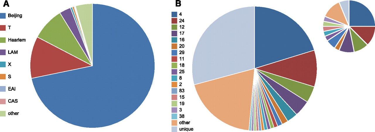 Molecular fingerprinting of Samaran M. tuberculosis isolates. (A) Prevalence of spoligotype families (n = 2350) (Vitol et al. 2006). (B) Prevalence of Beijing family VNTR types with cluster size of 10 or more (n = 1685). (Inset) VNTR types of isolates selected for sequencing (n = 32).