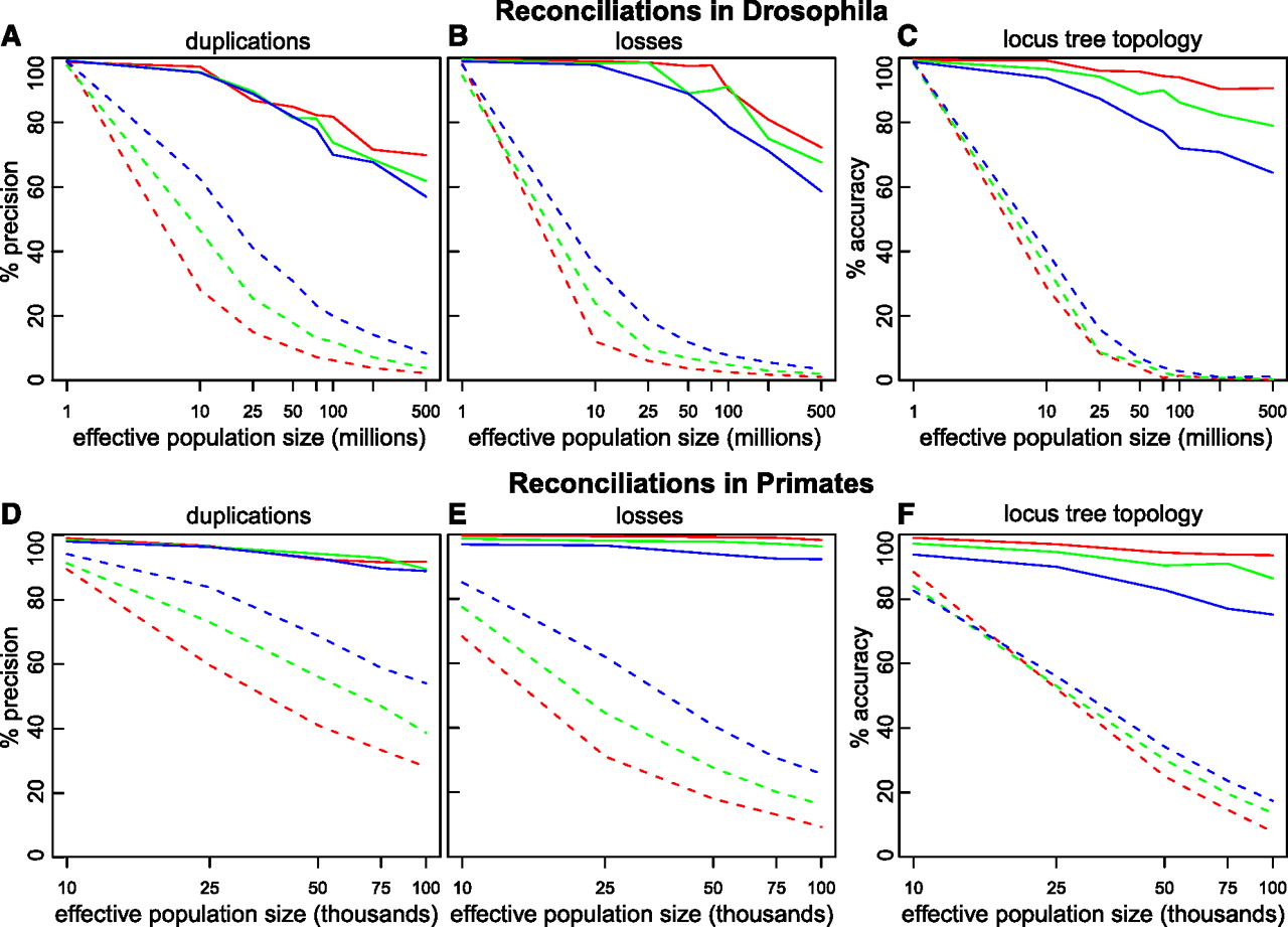 Increased performance of DLCoalRecon in simulated fly and primate gene trees. DLCoalRecon (solid) and MPR (dashed) were used to reconcile 500 fly and 500 primate simulated gene trees. Duplications and losses were simulated at rates that were the same as (1×, red), twice (2×, green), and four times (4×, blue) the rate estimated in real data. Increased performance is seen both in the precision of inferring duplications and losses (A,B,D,E) as well as the accuracy of reconstructing the locus tree topology (C,F).