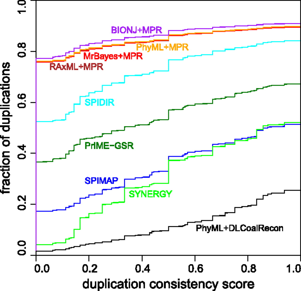 Cumulative distribution of duplication consistency scores. Each gene tree reconstruction program was used genome-wide to infer the duplications present in 16 fungi species. For each duplication, we computed the consistency score. Among all of the programs, the combination of PhyML+DLCoalRecon infers the fewest duplications with a score of zero (1.6%) and the most duplications with a score of one (74.5%).