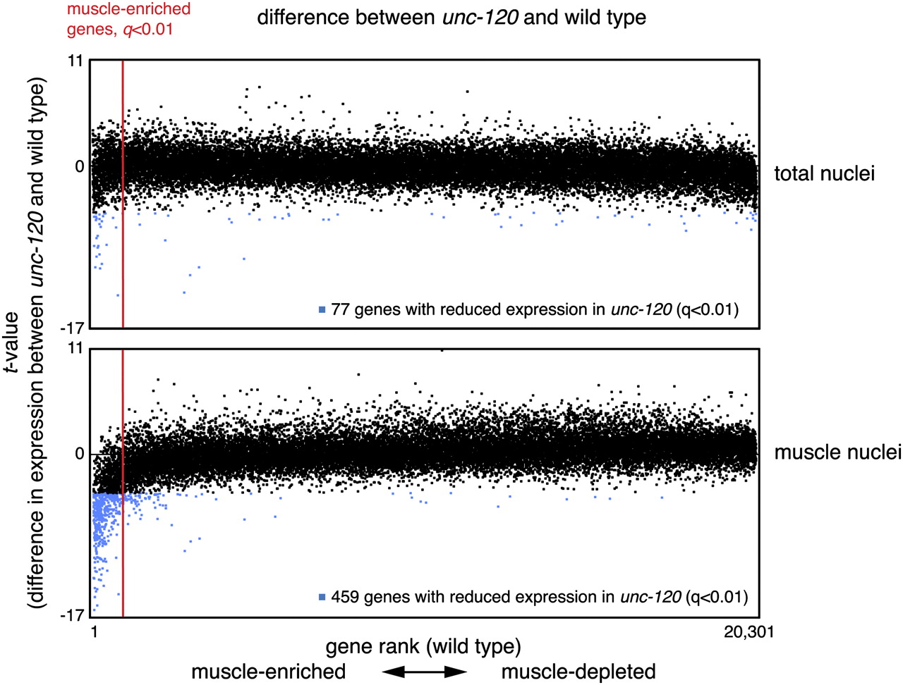 Nuclei purification enriches for muscle genes down-regulated in an unc-120 mutant. Nuclei were isolated from unc-120(st364) and wild-type background, and RNA from total nuclei and affinity-purified muscle nuclei was analyzed using high-density tiling arrays. Averages of four biological replicates of wild type and two biological replicates of unc-120 were used for the analysis. All 20,301 genes are ranked from muscle-enriched to muscle-depleted according to their difference in expression between total and muscle nuclei. T-values reflecting the differences between wild-type and unc-120 background are plotted on the y-axis. The top panel compares total nuclei and the bottom panel compares muscle nuclei. Genes with significantly reduced expression in unc-120 background are shown in blue (q < 0.01). The red line marks the cutoff for genes significantly enriched in muscle nuclei (q < 0.01).