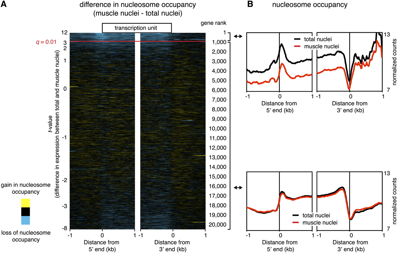 (A) Heat map showing differences in nucleosome occupancy at promoters and over gene bodies between total nuclei and muscle nuclei from C. elegans. Chromatin of total nuclei and affinity-purified muscle nuclei was digested to mostly mononucleosomes by MNase. Nucleosome-protected fragments were paired-end-sequenced, and the difference between normalized counts from purified nuclei and total nuclei was calculated. Genes were aligned at the 5′ end and at the 3′ end and ranked from highest to lowest difference in expression between purified nuclei and total nuclei. Yellow represents higher and blue lower nucleosome occupancy in muscle nuclei. The red line marks the q-value of 0.01. (B) Average nucleosome occupancy around the 5′ and 3′ ends for muscle-enriched genes (q < 0.01; upper panel) and non-muscle-enriched genes (lower panel). Profiles are shown for samples from total nuclei (black) and affinity-purified nuclei (red).