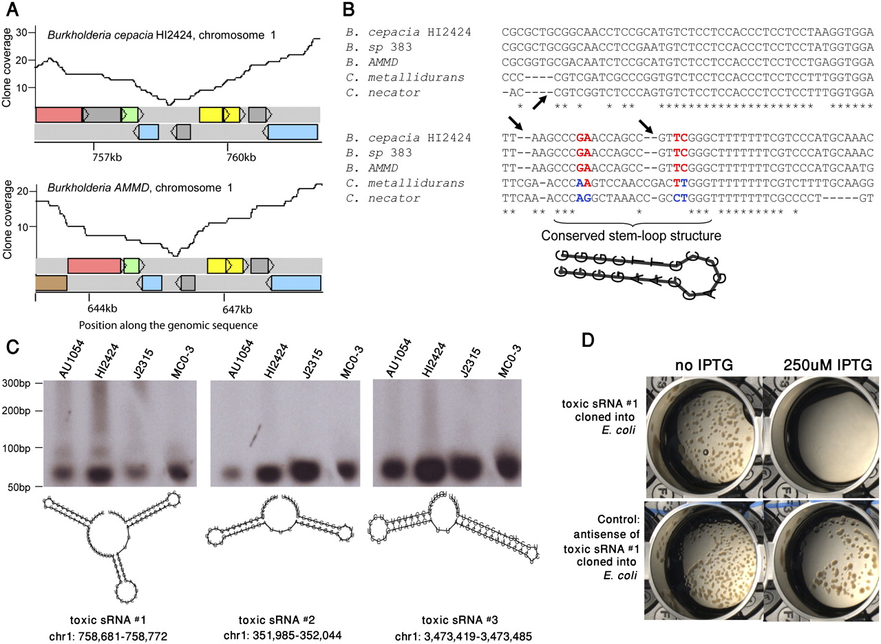 Toxic small RNAs reside in intergenic gaps. (A) Reproducibility of cloning deficiency of an intergenic region in Burkholderia. Coverage plots of a syntenic 6-kb region in chromosome 1 of two Burkholderia species. Colored rectangles represent genes. This region harbors toxic small RNA #1 (tsRNA #1). (B) Multiple alignment of the cloning-deficient intergenic region. The orthologous region to those shown in panel A was aligned between five closely related organisms. Arrows depict deletions that are not divisible by 3, indicating that this region does not code for protein. Compensatory, stem-preserving mutations are colored red/blue, indicative of conserved RNA structure. (C) Northern blot analysis of three tsRNAs found in intergenic gaps in Burkholderia. Radio-labeled probes for each of the tsRNAs were hybridized to the total RNA of four Burkholderia species: Burkholderia cenocepacia AU1054, B. cenocepacia HI2424, B. sp. J2315, and B. sp. MC0-3. Predicted secondary structures of small RNAs were calculated using RNAfold (Hofacker et al. 1994). Coordinates are given relative to the B. cenocepacia HI2424 genome. Two bands of tsRNA #1 probably indicate post-transcriptional sRNA processing of the long form (94 bases) into a shorter form (∼60 bases). (D) Toxicity of tsRNA #1 in E. coli. tsRNA #1 from B. cenocepacia HI2424 was cloned into E. coli under the control of IPTG-inducible promoter. (Top left) Colonies of E. coli grow when the expression of the tsRNA is suppressed. (Top right) Growth inhibition is observed following activation of tsRNA expression. (Bottom) Growth inhibition is not observed when the antisense of the small RNA is expressed in the same system.