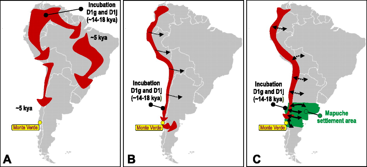 Migration models into the South American continent. The three migration models discussed are illustrated along with a timing of events resulting from our calculations: the incubation of population groups arriving from the north in a northern area of South America and a late split into coastal and continental population groups after the full development of all major D1g and D1j subclades (A); a coastal southward migration followed by the colonization of the continental interior by trans-Andean migrations, with limited later exchange along the cordillera (B); and a coastal southward migration and trans-Andean colonization of the continental interior, followed by extensive trans-Andean migrations, especially in the south, with the Mapuches favoring bidirectional gene flow between west and east in the Southern Cone (C). The latter is the most likely model from our results.