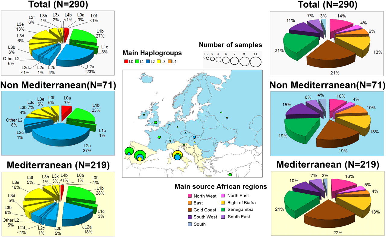The pie charts on the left indicate the frequency distribution of African haplogroups in Europe; the color circles within the map indicate the distribution of entire genomes in Europe clustered in main haplogroups. The pie charts on the right show the admixture components of L-European lineages in Africa.