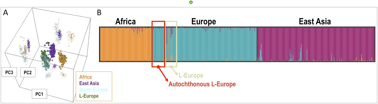(A) 3D principal component analysis performed on samples analyzed in the present study (L-European carriers), Africans (n = 102; CEPH panel), East Asians (n = 229; CEPH panel), and South Europeans (n = 160; data set from Spain and Italy taken from SNPforID (Sánchez et al. 2006; Phillips et al. 2007), all genotyped for a panel of 34 AIMs. The genotyping data were compiled using SPSmart (Amigo et al. 2008). (B) Structure bar plot indicating ancestral components of L-European mtDNA carriers based on profiles derived from a set of 34 AIMs.