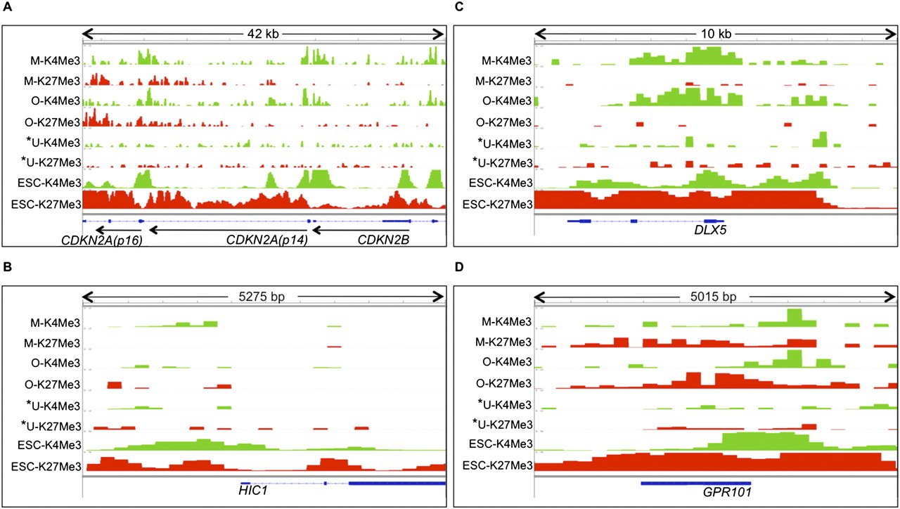 Plots of H3K4Me3 and H3K27Me3 enrichment in MSCs (M-K4Me3 and M-K27Me3), osteoblasts (O-K4Me3 and O-K27Me3), U2OS (U-K4Me3 and U-K27Me3), and ESCs (ESC-K4Me3 and ESC-K27Me3). (*) Cell type in which the gene is identified as methylated. (Green and red boxes) Peak height normalized to background enrichment for H3K4Me3 and H3K27Me3, respectively. Genes represented include CDKN2A (p14), CDKN2B (p15), and CDKN2A (p16) (A), DLX5 (B), HIC1 (C), and GPR101 (D).
