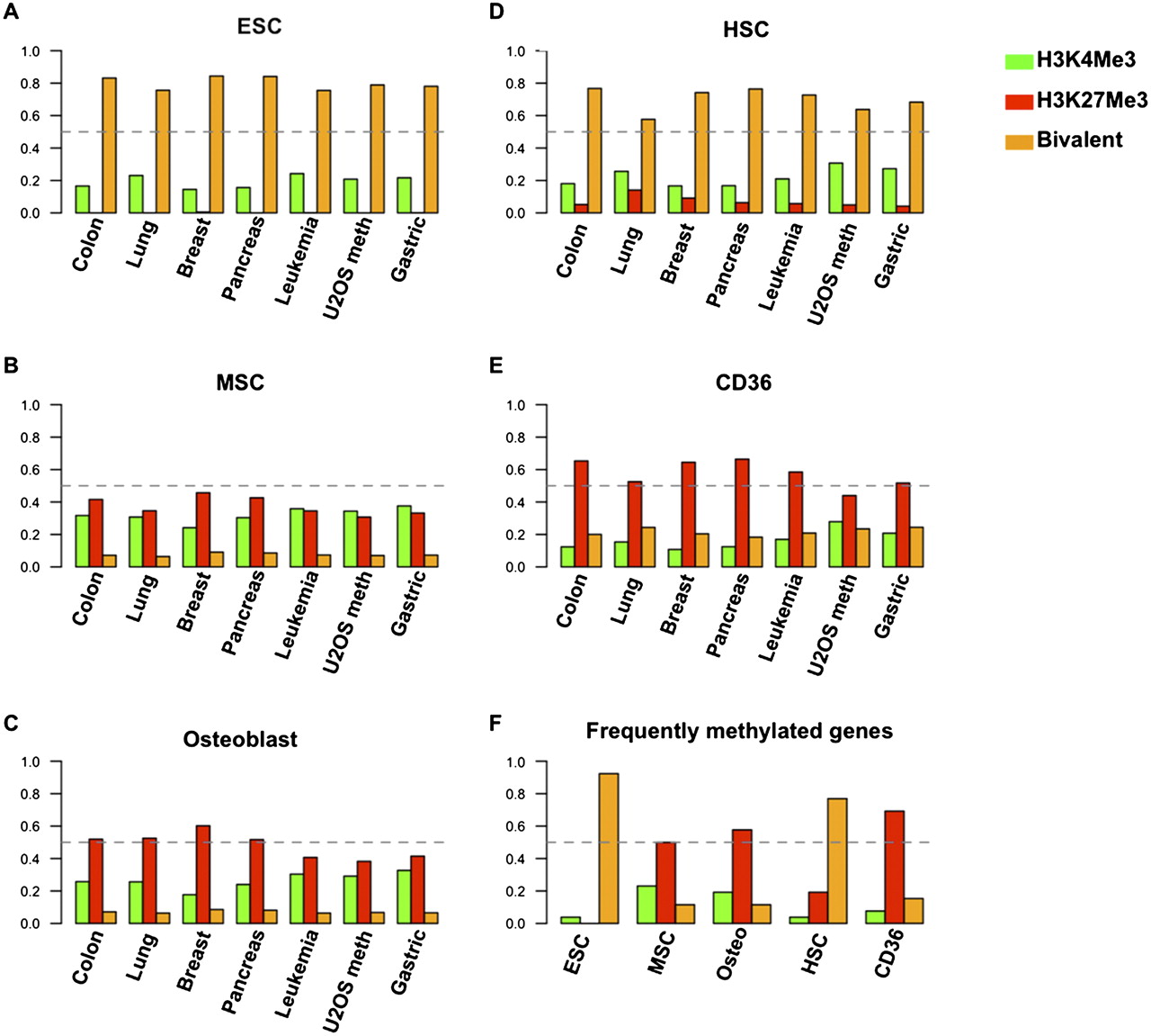 Genes hypermethylated in a wide range of cancers are enriched for bivalent chromatin in ESCs and HSCs or H3K27Me3 in MSCs and CD36 erythroid progenitor cells or osteoblasts. Plots of the percentage of methylated genes tracing to each chromatin category (indicated by color for the chromatin type) of each of the cell types listed are indicated for each of the tumor types listed on the x-axis. (Dashed lines) The 50% mark for fraction of methylated genes. (A–E) Plots track the histone marks present for methylated genes based on the chromatin composition of ESCs, HSCs, MSCs, CD36, and osteoblasts, respectively. (F) Summary of the chromatin marks in each cell type for genes that are hypermethylated in at least 50% of cell lines in each tumor type.
