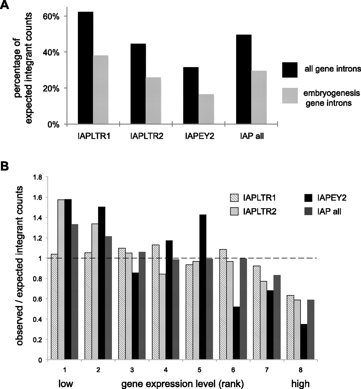 Young ERVs are excluded from introns, particularly from embryogenesis and highly expressed genes. (A) “Observed” ERV integrant counts are plotted as percentages of “expected” counts within all gene introns (black histograms) or embryogenesis genes (gray). Genomic locations of various classes of ERVs (x-axis) were identified in diverse mouse lineages. Expected counts were determined by random simulation of 2 million insertion sites across the reference genome. By chance, ∼35% of ERV insertions would be expected to fall within RefSeq gene introns, and ∼2.7% of all insertions would fall within embryogenesis genes, defined by the Mouse Genome Informatics database (http://www.informatics.jax.org). This normalization corrects for gene lengths. Percentages <100% signify relative exclusion of certain ERV subtypes from particular gene categories. (B) Based on their expression levels in mouse ES cells measured by microarrays (Mikkelsen et al. 2007), genes were binned into eight groups ranked from 1 (lowest expression) to 8 (highest), each with roughly equivalent numbers of genes expressed at comparable levels. Ratios of the observed numbers of genes containing intronic ERV integrants versus the expected number of genes identified by random simulation are presented (Brady et al. 2009) for different classes of ERV integrants (key, upper right). (Dashed line) Ratio = 1 signifies equivalence between observed and expected counts; ratios < 1 signify relative exclusion of ERV integrants from particular groups of genes.