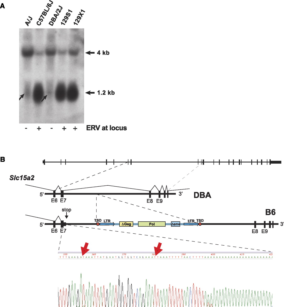 Transcriptional termination occurs at pre-existing signal upstream of ERV. (A) Prematurely terminated transcripts are present at low levels (arrows) in kidneys of mouse strains lacking the polymorphic ERV, indicating that the premature transcriptional polyadenylation signal exists both in strains that have or lack the ERV, and is not templated by the ERV per se. (B, top) Schematic of the Slc15a2 locus showing site of premature transcriptional termination ∼1.5 kb upstream of the intronic ERV polymorphism present in the B6 strain, in intron 7. (Bottom) Sequence trace from 3′-RACE experiment, demonstrating that the 3′ end of the prematurely truncated transcript is polyadenylated ∼1.5 kb upstream of the ERV and contains no ERV-templated sequences per se. (Red arrows) Weak pre-existing polyadenylation signals (i.e., 5′-GATAAA and ATTAAA) are present in the intron, immediately upstream of the added poly(A) tail. GenBank accession numbers JF495121–JF495122.