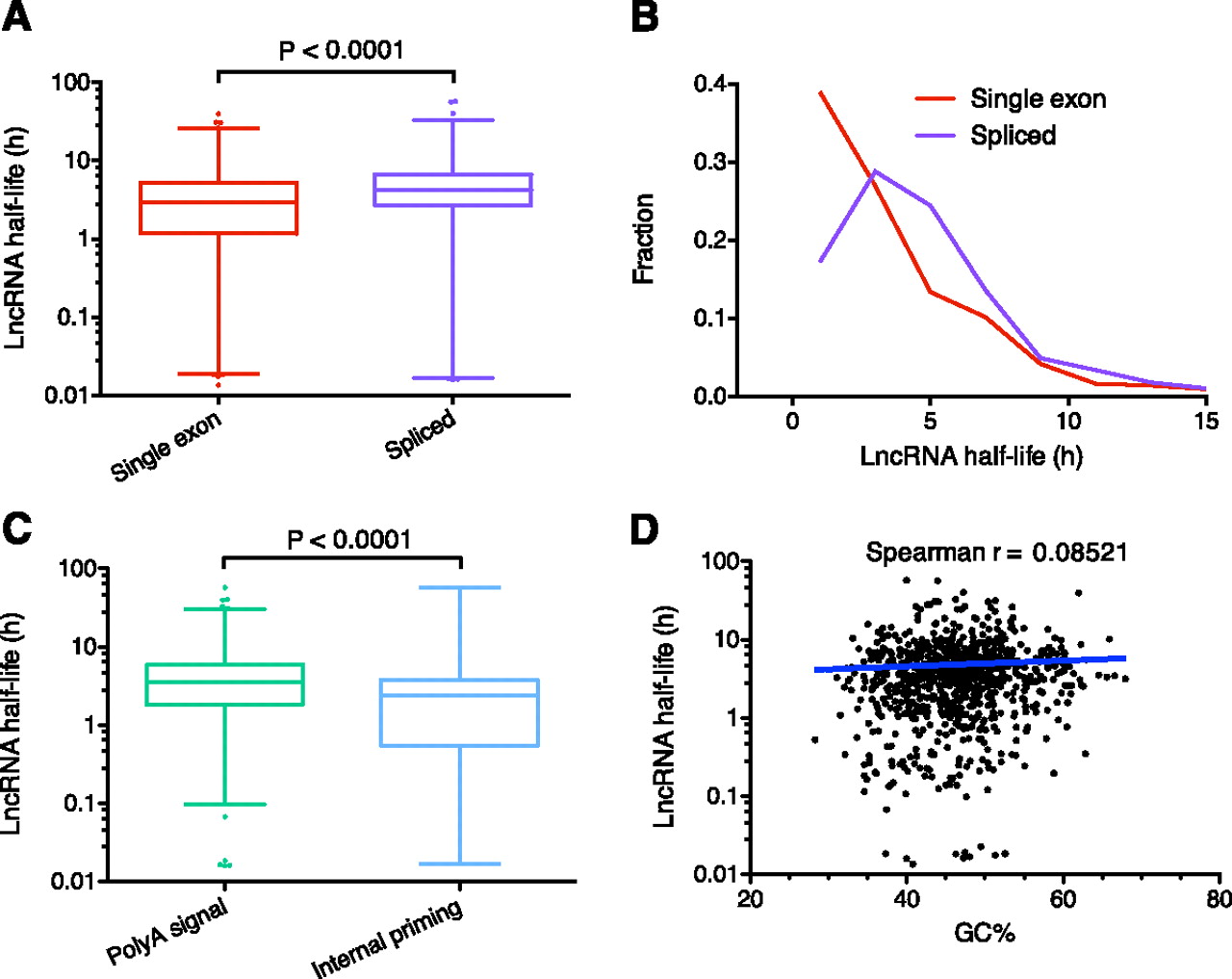 LncRNAs and decay elements. (A) Comparison of the stability of single exon versus spliced lncRNAs. Box-and-whisker plot. (Whiskers) 1st–99th percentile, with individual transcripts outside this shown as dots. (Box) 25th–75th percentile. Difference calculated using a nonparametric Mann-Whitney t-test. (B) Frequency distribution showing the fraction of single exon versus spliced lncRNAs in 2-h bins. Plotted points are at the center of the 2-h bin. Only time points with 1% or more of transcripts are plotted. (C) Comparison of the stability of lncRNAs containing a major or minor polyA signal versus those with evidence of internal priming. Box-and-whisker plot and statistical testing as per A. (D) Correlation between GC% and lncRNA half-life. Spearman correlation = 0.0852 (P = 0.0145) indicates a small positive relationship between increased half-life and lncRNAs with higher GC%. Spearman correlation utilized because data is non-Gaussian. Trend line shows a semilog fit from nonlinear regression. Axes are log10-linear.