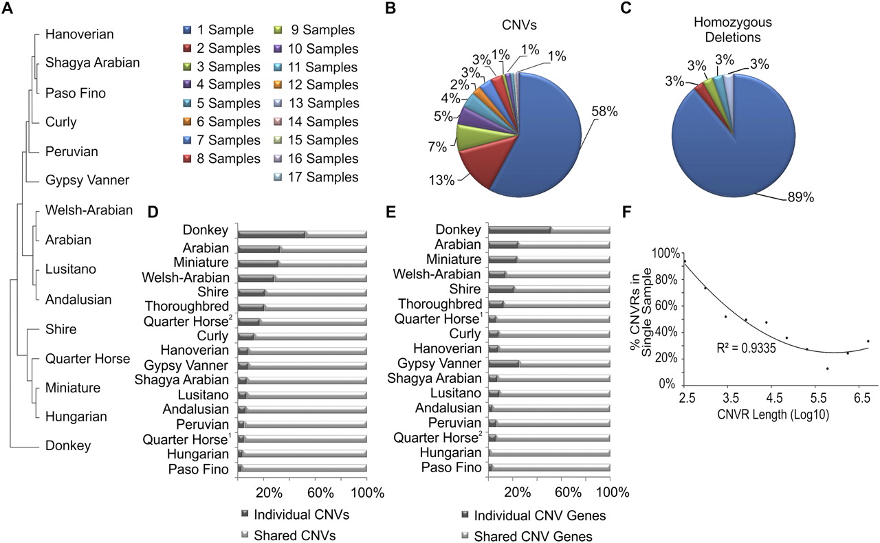 Analysis of CNVs among horse breeds and donkey. (A) Hierarchical clustering analysis of CNVs. (B) Percentage of CNVs shared among samples. (C) Percentage of homozygous deletions shared among samples. (D) Comparison of individual and shared CNVs among horse breeds and donkey. (E) Comparison of individual CNV genes in all animals. (F) Correlation between the size and percentage of individual CNVRs.