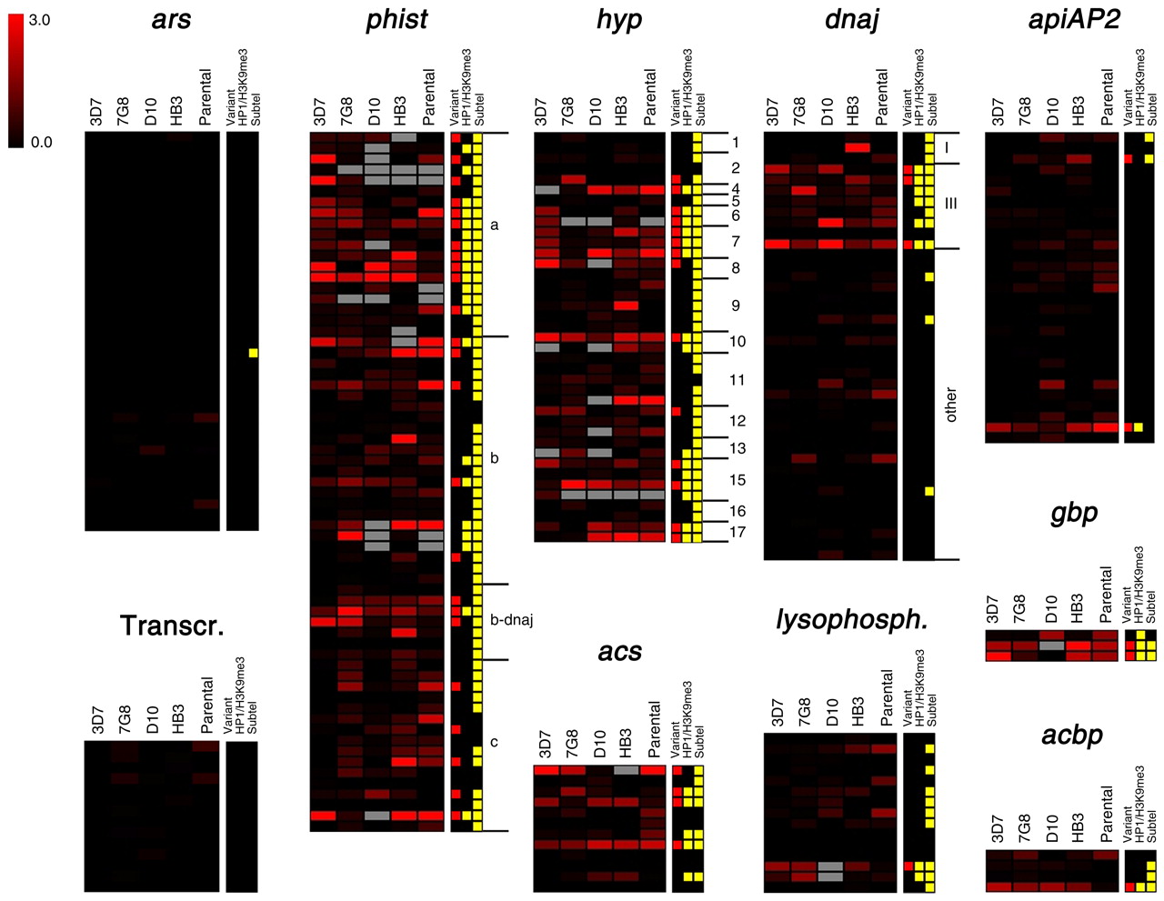 Distribution of variant expression in P. falciparum gene families. The log2 of the aMAFC for each comparison is shown for the genes of selected families. Aminoacyl-tRNA-synthetases (ars) and genes encoding the basal transcription machinery (Transcr.) (Bischoff and Vaquero 2010) provide appropriate controls as gene sets encoding essential genes, for which variant expression is not expected. For phist, hyp, and dnaj families, the specific family identity is indicated at the right of the heatmaps. Gene families are detailed in Supplemental Table S4. The tracks at the right indicate whether a gene was included in the list of variant genes (Supplemental Table S2), whether it was positive for heterochromatin marks HP1 or H3K9me3 in any of the published reports (Flueck et al. 2009; Lopez-Rubio et al. 2009; Salcedo-Amaya et al. 2009), and whether it is subtelomerically located (<150 kb from a chromosome end). Genes that show high aMAFC in some of the tracks but are not in the list of variant genes were excluded because changes in expression were attributable to CNVs, or for other reasons detailed in the text.