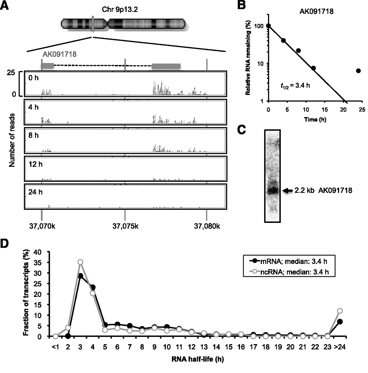 Typical BRIC-seq data. (A) Typical mapping data of RNA-seq tags obtained from BRIC-seq using a Genome Analyzer (Illumina). The chromosomal locus of AK091718 is shown. (B) The relative level of AK091718 RNA remaining was determined by BRIC through deep sequencing. The numbers of sequencing tags at the various time points are shown in A. The relative quantitative values at time 0 h were arbitrarily adjusted to 100%. (C) The expression of AK091718 in HeLa TO cells assessed by Northern blot hybridization. (D) Distribution of RNA half-lives determined by BRIC-seq. BRIC-seq determined the half-lives of 11,052 mRNAs and 1418 ncRNAs expressed in HeLa TO cells. (Black circles) The fraction of mRNAs; (white circles) the fraction of ncRNAs. Transcripts with a half-life >24 h are included in the category “>24.”