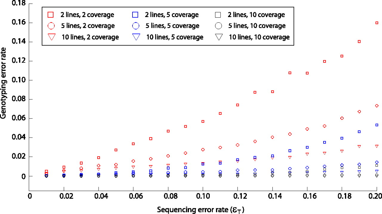 Genotyping error rate as a function of sequencing error rate, coverage, and sample size. At a single site, sequencing read data were simulated for either two (square), five (circle), or 10 (triangle) lines assumed to be homozygous for the nucleotide A. These were considered in combination with simulated coverage of either two reads (red), five reads (blue), or 10 reads (black). For sequencing error rates ranging from 0.01 to 0.20, the JGIL genotyping error rate was calculated across 10,000 replicate simulations.
