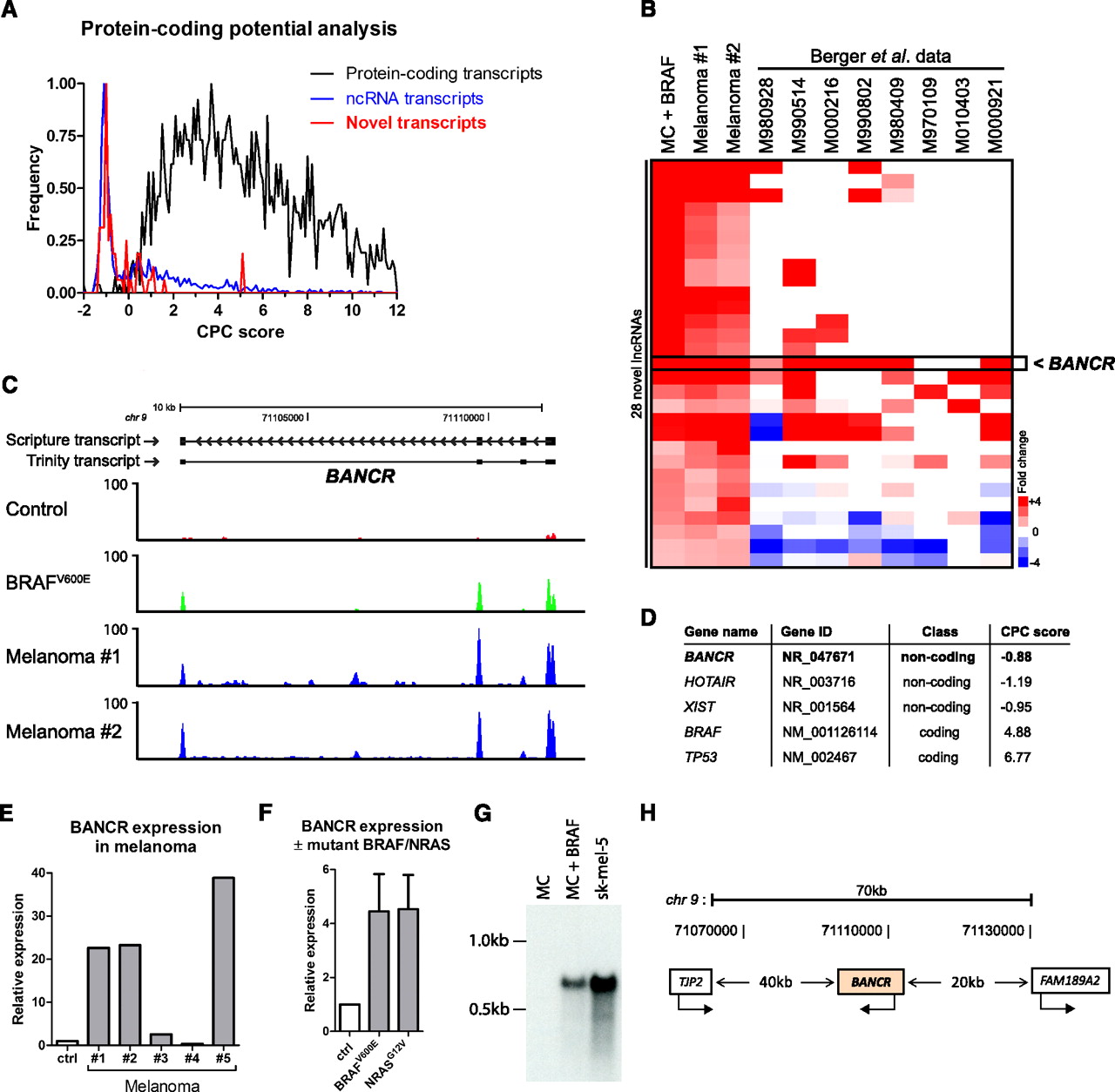 Oncogenic BRAFV600E regulates expression of many novel transcripts. (A) Frequency distribution plot showing coding potential analysis (CPC scores) of novel transcripts discovered by de novo assembly. One thousand five hundred random annotated ncRNAs and 1500 random protein-coding genes were also analyzed for reference. (B) Analysis of BRAF up-regulated novel lncRNAs in a publicly available melanoma RNA-seq data set. We remapped and reanalyzed Berger et al. (2010) data and derived expression values for novel transcripts up-regulated in all three of our samples. Robustly up-regulated novel transcripts (with negative CPC scores) were clustered with Berger et al. (2010) data revealing recurrently highly expressed lncRNAs. (C) Histograms of raw RNA-seq data in control sample, in melanocytes overexpressing BRAFV600E and in both primary melanomas (Mel. 1, Mel. 2). Scripture and Trinity assembly for BANCR is also shown. y-axis is number of RNA-seq reads normalized for mapping variation. (D) CPC score for BANCR. Examples of lncRNAs HOTAIR and XIST and protein-coding genes BRAF and TP53 are shown for reference. (E) BANCR expression in primary melanomas validated by qRT-PCR. (F) BANCR expression in melanocytes overexpressing BRAFV600E or NRASG12V measured by qRT-PCR. Data are means from three experiments ± SD. (G) BANCR Northern blot using RNA from control melanocytes (MCs), melanocytes overexpressing BRAFV600E, or sk-mel-5 melanoma cells. (H) Schematic of BANCR locus.