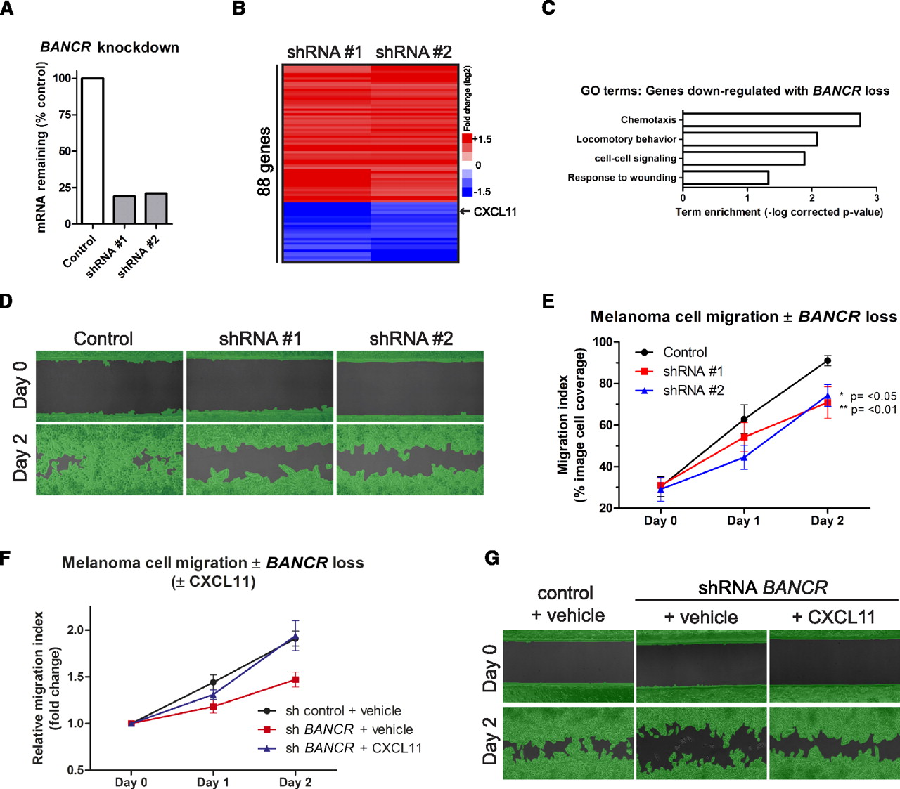 BANCR loss impairs melanoma cell migration. (A) Quantification of BANCR knockdown by qPCR using two independent shRNAs. (B) Microarray analysis of Colo829 melanoma cells following shRNA knockdown of BANCR. (C) Significant gene ontology (GO) terms associated with genes repressed by BANCR loss. (D) Representative images showing amount of cell migration at day 0 and day 2. Melanoma cells were infected with lentivirus expressing either nontargeting control shRNA (control) or one of two duplicate independent shRNA sequences targeting BANCR (shRNA 1, shRNA 2). Green highlight, shown for clarity, is a mask applied by the analysis software for accurate, unbiased migration quantification. (E) Quantification of replicate images (n = 6 per timepoint) taken over migration assay timecourse. Values are means from two independent experiments ± SD. Statistical analysis performed by one-way ANOVA, **P ≤ 0.01, *P ≤ 0.05 versus control. (E) Quantification of replicate images (n = 3 per timepoint) taken over migration assay timecourse ± CXCL11. Cells were infected with shRNA control lentivirus and treated with vehicle (PBS), infected with BANCR shRNA, and treated with vehicle or infected with BANCR shRNA and treated with CXCL11 (10 ng/mL). (G) Representative images showing amount of cell migration at day 0 and day 2.