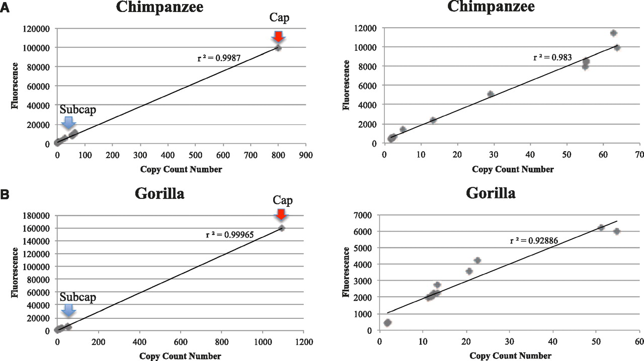 Distribution copy number counts versus fluorescence. Copy number estimates of sequence read-depth for each genomic region correlate strongly (r2 = 0.99) with measured fluorescence intensity for every probe distributed on chromosome 2 and chromosome 10 (see Supplemental Table S3). Red arrows show the location of the single probe positive for cap, while blue arrows display the group of probes positive for subcap in (A) chimpanzee and (B) gorilla (left panels). The correlation rates reduce when hyperexpanded segments are excluded from the analysis (right panels).