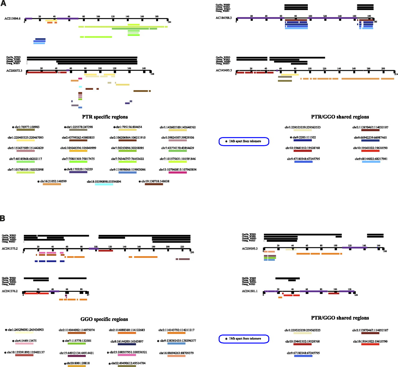 Genomic organization based on large-insert clone sequencing. Sequence organization shown for large-insert BAC clones that carry StSat sequences in (A) chimpanzee and (B) gorilla. Sequences were annotated for the presence of duplications (whole-genome shotgun sequence detection [WSSD]) in each species (black bars above line), StSat sequence (purple), and the location of segmental duplications in the human genome based on BLAST sequence similarity searches (colored bars). Patchworks of segmental duplications are mixed with tracts of StSat sequences in all the clones analyzed.