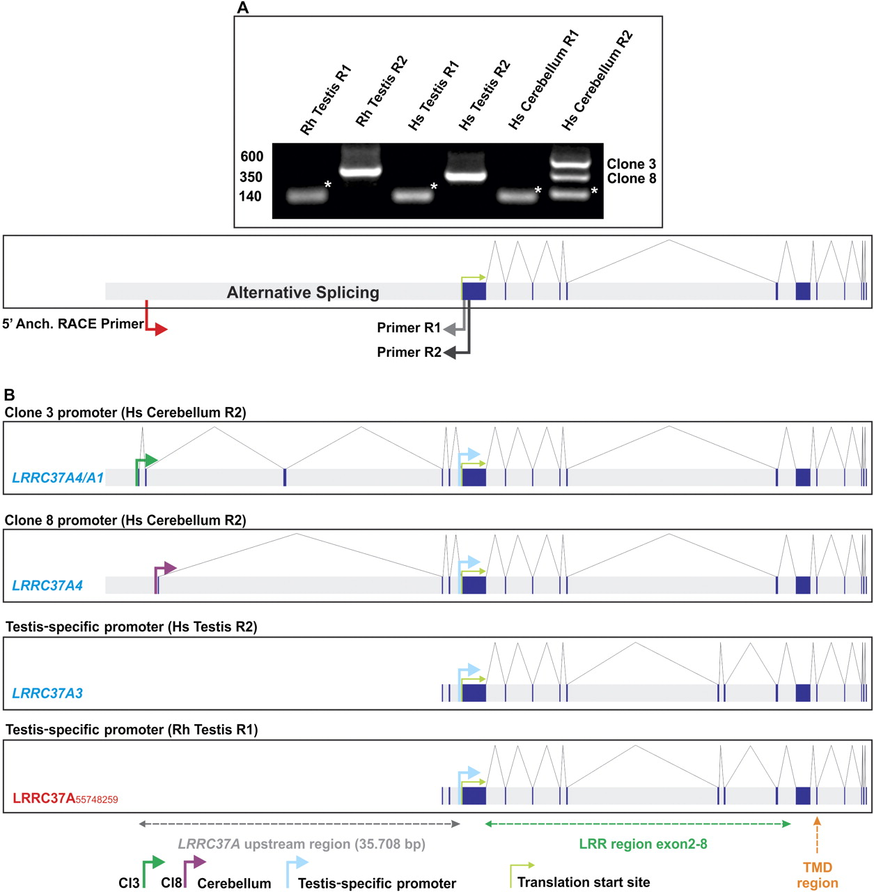 Identification of LRRC37 promoter regions in human and macaque. (A) RACE-PCR analysis on the cDNA isolated from the total RNA extracted from human [(Hs) Homo sapiens] and macaque [(Rh) Macaca mulatta] by using testis and cerebellum tissues. Two sets of primer pairs specific for macaque (Rh) and human (Hs) were used for final nested PCR amplification, Rh testis R1 and R2, Hs testis R1 and R2, and Hs cerebellum R1 and R2, respectively. Three PCR products were observed, cloned, and subsequently sequenced. (*) A PCR band for nonspecific amplification. (B) Schematic representation of RACE-PCR transcripts embedded on the structure of the detected LRRC37 gene structure after sequencing analysis. Promoter regions for corresponding transcripts (cerebellum clone 3 [Cl3] and cerebellum clone 8 [Cl8]) and testis-specific promoter (T1) from human (Hs Testis R2) and macaque (Rh Testis R2). (Orange arrow) The transmembrane domain (TMD).