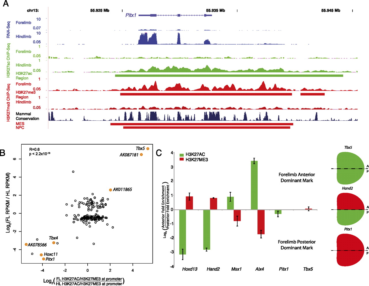 Relative H3K27ac and H3K27me3 enrichments at promoters correlate with gene expression in E10.5 limb buds. (A) Gene expression (blue), H3K27ac signal (green), and H3K27me3 signal (red) at the hindlimb-specific gene Pitx1. All signal plots represent reads per million mapped total reads. Green and red bars below signal plots, respectively, illustrate H3K27ac or H3K27me3-enriched regions in limb. H3K27me3-enriched regions in MES and NPC cell lines are shown at bottom. The figure was generated using the UCSC Genome Browser. (B) Scatterplot of the ratio of log2(RPKM) values for genes differentially expressed between forelimb and hindlimb versus the log2(ratio of H3K27ac vs. H3K27me3 signals at their promoters). Selected known and novel limb genes that show strong correlations between these values are indicated in orange. The P-value shown was calculated using a linear regression t-test. (C) Bar chart depicting relative levels of H3K27ac and H3K27me3 enrichment at indicated gene promoters in the anterior and posterior halves of E10.5 forelimb buds. (Right) The dominant mark present for representative genes that are ubiquitously expressed (Tbx5), completely repressed (Pitx1), or regionally restricted (Hand2).