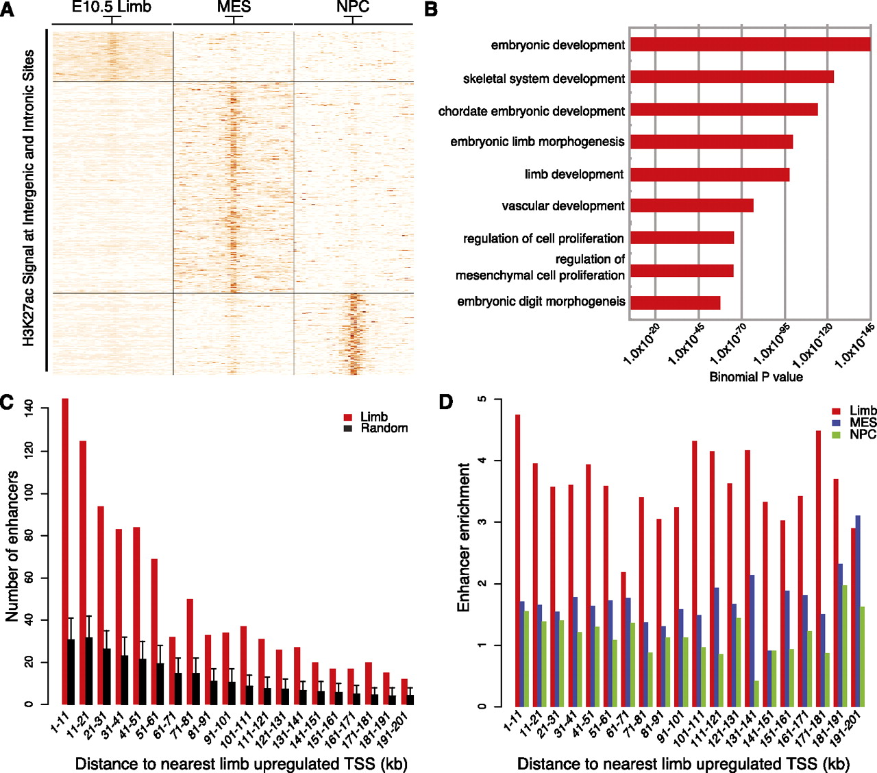 Tissue-specific H3K27ac intergenic and intronic regions are associated with genes up-regulated in E10.5 limb. Intergenic and intronic H3K27ac regions in limb, MES, and NPC were identified and merged as described in the main text. (A) K-means clustering of H3K27ac signals (in RPKM) across 39,750 merged regions, using an 8-kb window centered on the midpoint of each region, revealed three tissue-specific classes of H3K27ac-enriched regions. (B) Selected GO Biological Process category enrichments identified by GREAT analysis of “limb-specific” H3K27ac regions. (C) Counts of limb-specific H3K27ac regions (red) relative to random sites (black) near genes up-regulated in limb. Each region was assigned to the nearest transcription start site up to 200 kb away, and enrichment of limb-specific regions near limb up-regulated genes was calculated in 10-kb bins. Error bars represent the 95% quartile of values from 1000 randomized sets of intergenic and intronic sequences. (D) Enrichment of assigning a limb (red), MES (blue), or NPC-specific region (green) to a limb up-regulated gene versus random regions used in C up to 200 kb away.
