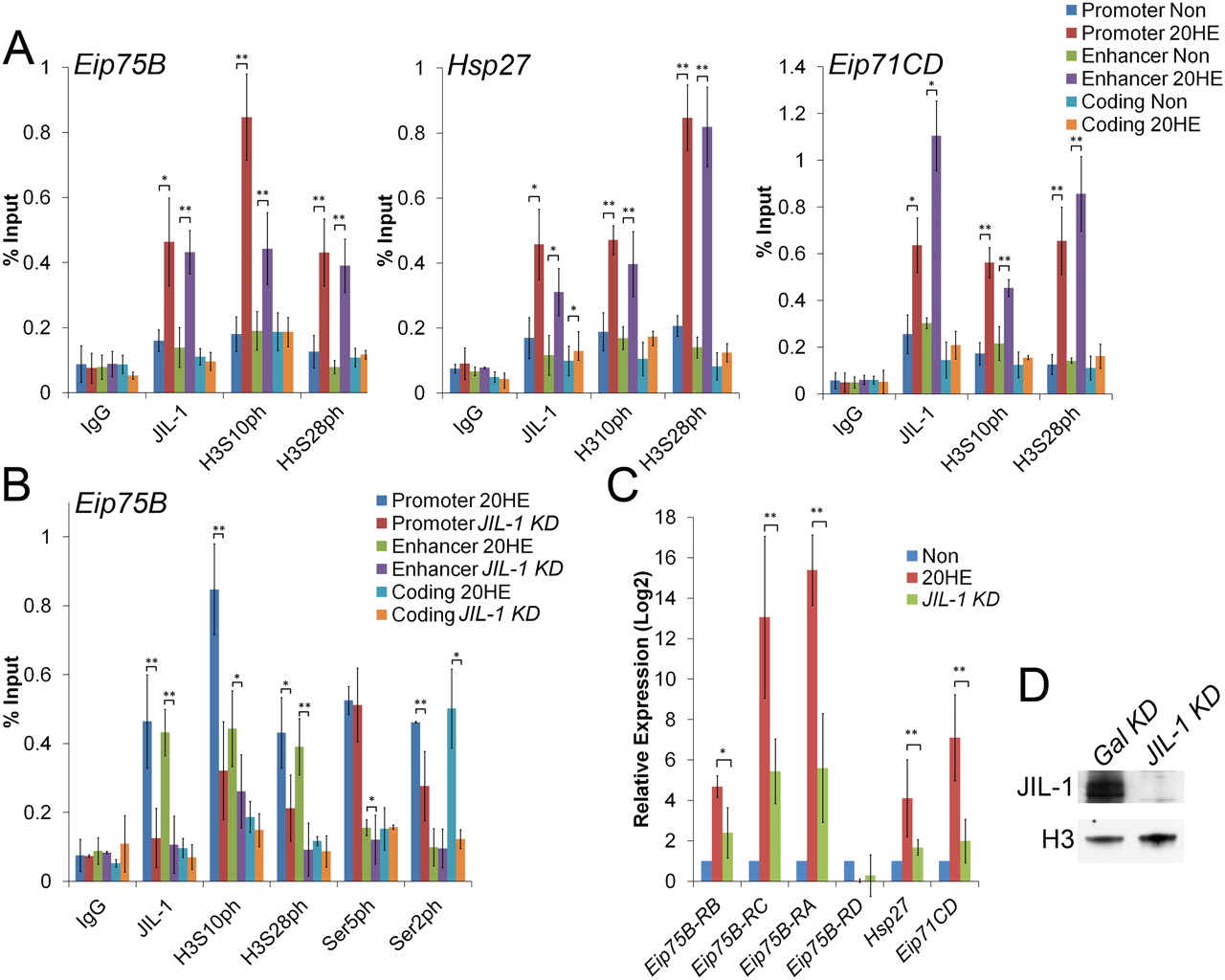 JIL-1 is required for phosphorylation at enhancers and promoters upon ecdysone transcriptional activation. (A) ChIP analysis of Kc167 cells treated for 3 h with ethanol (Non) or 20-HE (20HE). Antibodies used for pull-down are indicated along the x-axis. (Ser5ph) RNAPII phosphorylated on serine 5 of CTD, (Ser2ph) RNAPII phosphorylated on serine 2 of CTD. DNA was quantified by real-time PCR using primers designed to amplify the promoter, enhancer, and coding regions of each of the three genes. (B) ChIP analysis in Kc167 cells in which JIL-1 or Gal expression was inhibited by RNAi. Cells were treated with 20-HE for 3 h. Antibodies used are indicated along the x-axis. (Ser5ph) RNAPII phosphorylated on serine 5 of CTD, (Ser2ph) RNAPII phosphorylated on serine 2 of CTD. DNA was quantified by real-time PCR, and results are reported as percentage of input. (C) RNA expression analysis in cells treated with dsRNAs corresponding to the JIL-1 or Gal genes. Cells were treated with ethanol (Non) or 20-HE (20HE) for 3 h. RNA levels were determined by qPCR using primers specific to each of the four Eip75B transcripts. All samples were normalized to the mitochondrial gene myt:Col and the Non sample was set to 1 for comparison. (D) Western analysis of dsRNA-treated cells showing undetectable levels of JIL-1. Error bars represent the standard deviation of the mean of 3 biological replicates. (*) P < 0.05, (**) P < 0.01.