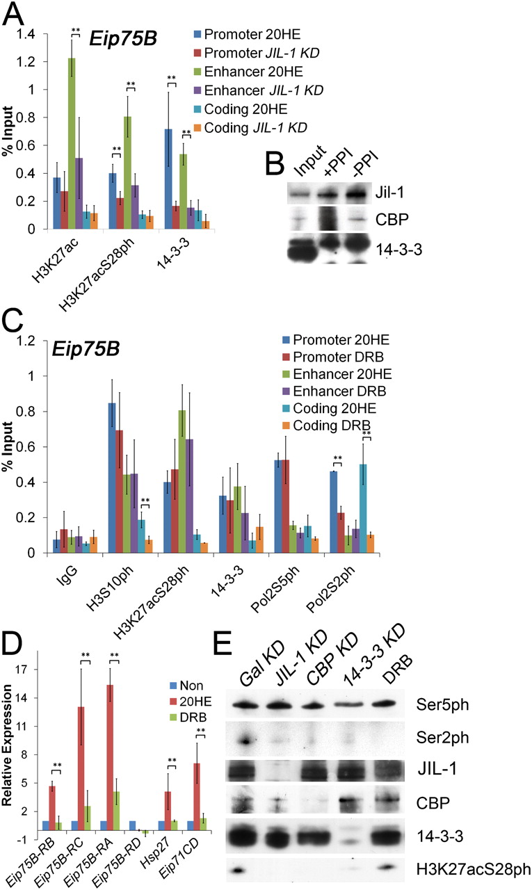 14-3-3 recruitment and H3K27 acetylation are dependent on JIL-1 kinase at enhancers and promoters. (A) Kc167 cells treated with dsRNAs to Gal or JIL-1 were incubated with 20-HE for 3 h and subjected to ChIP analysis using the antibodies indicated along the x-axis. DNA was quantified by real-time PCR and reported as a percent of the input. (B) Kc167 cell lysates with and without phosphatase inhibitors (PPI) were immunoprecipitated using antibodies against JIL-1, loaded 1:10 with respect to input, and subjected to Western analysis using antibodies against JIL-1, CBP, and 14-3-3. (C) Using Kc167 cells pretreated for 5 min with 100 μM DRB followed by 3-h treatment with 20-HE (20HE), ChIP was performed using the antibodies indicated along the x-axis and quantitated by real-time PCR using primers designed to amplify the promoter, enhancer, and coding regions of the Eip75B gene. (D) Relative expression analysis of the DRB-treated cells compared with normal 20-HE induction using primers specific to each of the four transcripts of Eip75B. All samples were normalized to mitochondrial gene product myt:Col and the Non sample set to 1 for comparison. Error bars represent the standard deviation of the mean of 3 biological replicates. (E) Western analysis of lysates from Kc167 cells treated with dsRNAs corresponding to the JIL-1, CBP, 14-3-3, or Gal genes; cells were pretreated with DRB for 5 min and with 20-HE for 3 h. Error bars represent the standard deviation of the mean of 3 biological replicates. (*) P < 0.05, (**) P < 0.01.