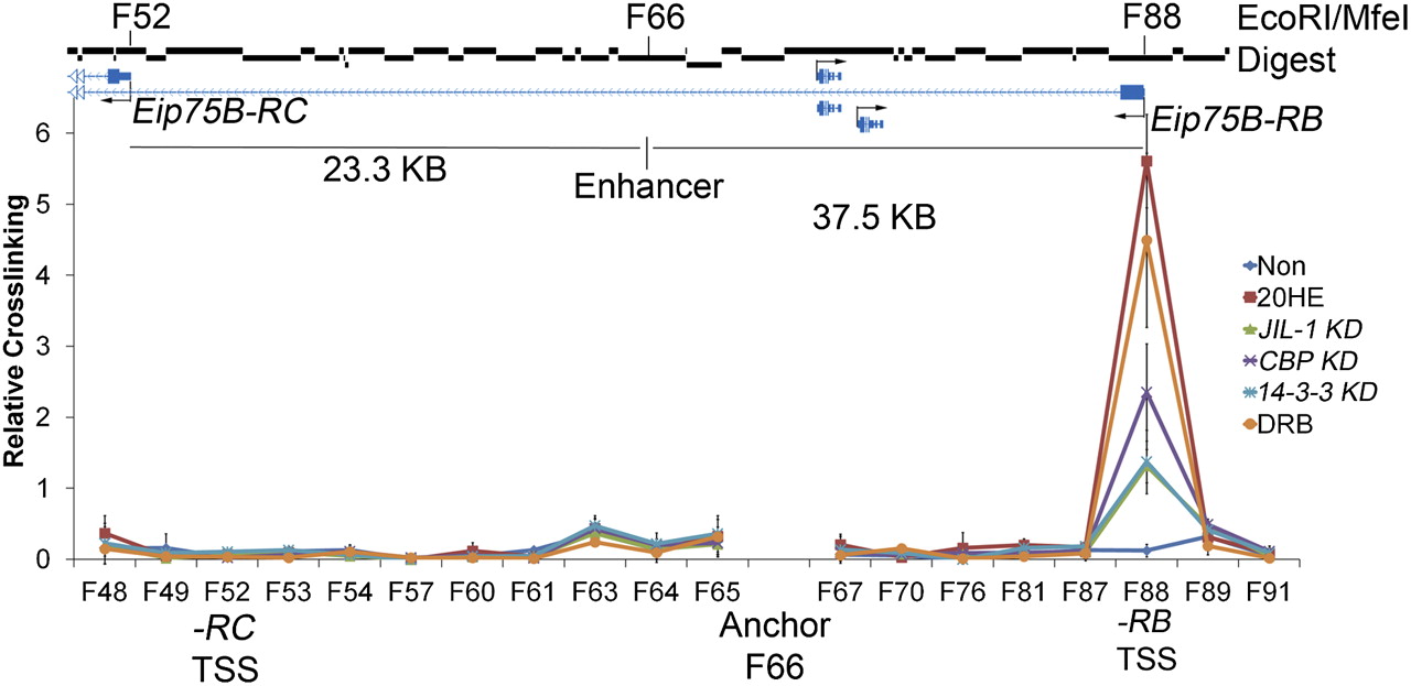 JIL-1, 14-3-3, and CBP are required for enhancer-promoter interactions. 3C analysis of Kc167 cells after Gal knockdown and treatment with ethanol (Non) or 20-HE (20HE) for 3 h was performed in normal cells as well as cells in which the expression of the JIL-1, CBP, 14-3-3, or Gal genes was inhibited by treatment with the corresponding dsRNAs. 3C analysis was also done on cells treated with DRB for 5 min. Cross-linking efficiencies are reported after normalizing to a BAC clone with an insert of 170 kb containing the entire Eip75B locus. A restriction digest of this DNA gives 112 fragments numbered 1 to 112, beginning with the first fragment of the BAC. Error bars represent the standard deviation of the mean of 3 biological replicates.