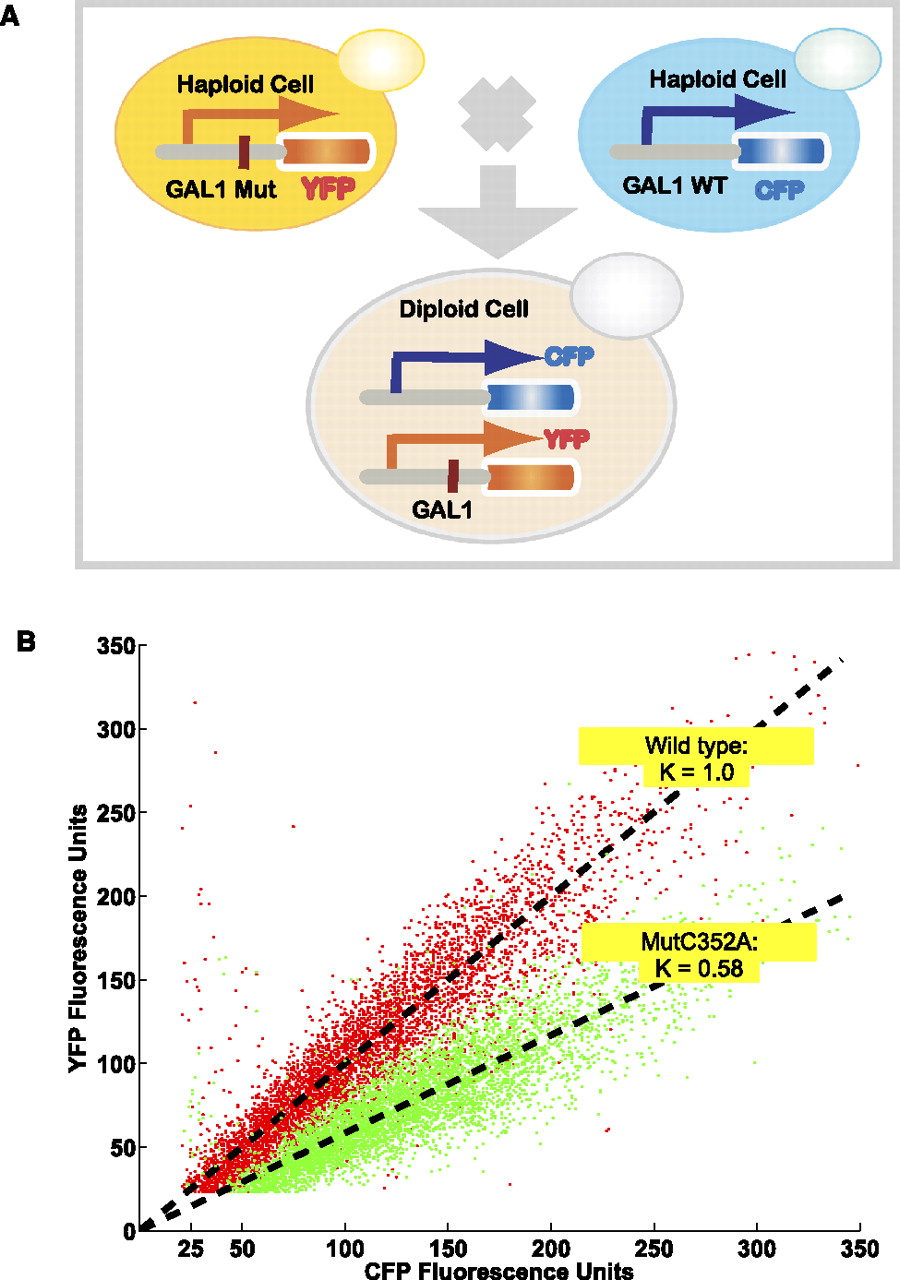 Overview of detecting expression variation for the mutation library. (A) Design of dual-color reporter system; (red bar) single nucleotide mutation; (WT) wild type; (MUT) mutant. (B) An example of determining the expression level (mutant strain Mut C352A, position 352, C → A mutation). Each dot represents the CFP and YFP fluorescence intensities from one cell. (Red dots) Cells from a wild-type diploid strain carrying a gal+-YFP and gal+-CFP fusion. The slope represents the mean of the YFP-versus-CFP ratio for a population of cells (normalized, k = 1). (Green dots) Cells from the Mut C352A strain carrying a gal--YFP and gal+-CFP fusion. The slope represents the mean for the mutant population (k = 0.58). The relative ratio between two slopes indicates the expression variation.