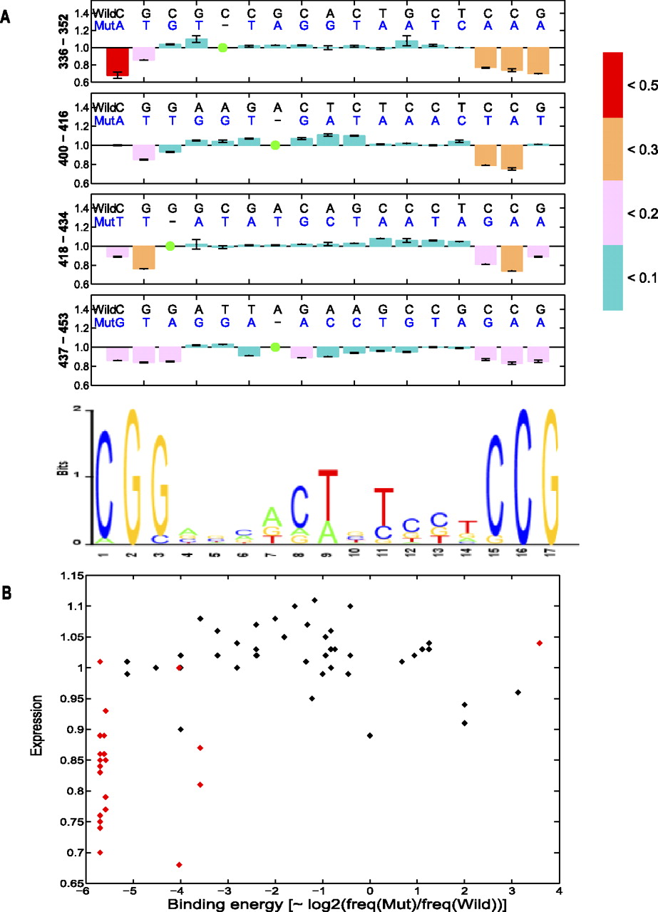 Expression variations among four Gal4 binding sites in the GAL1-10 regulatory region. (A) The motif pattern of the Gal4 binding site is created based on the position weight matrix reported in TRANSFAC. Expression levels of each position in the Gal4 sites are shown with different colors to discriminate the degree of changes (see color map). (Green circles) Nonmutated positions. Error bars are 1 standard deviation among different yeast transformants from the same mutant construction. (B) The correlation between gene expression and binding energy for the four Gal4 binding sites. The binding energy is proportional to the log [freq(Mut)/freq(Wild)] (Stormo 1998). (Red spots) The high information content sites of the Gal4 PWM; (black spots) the low information content sites.