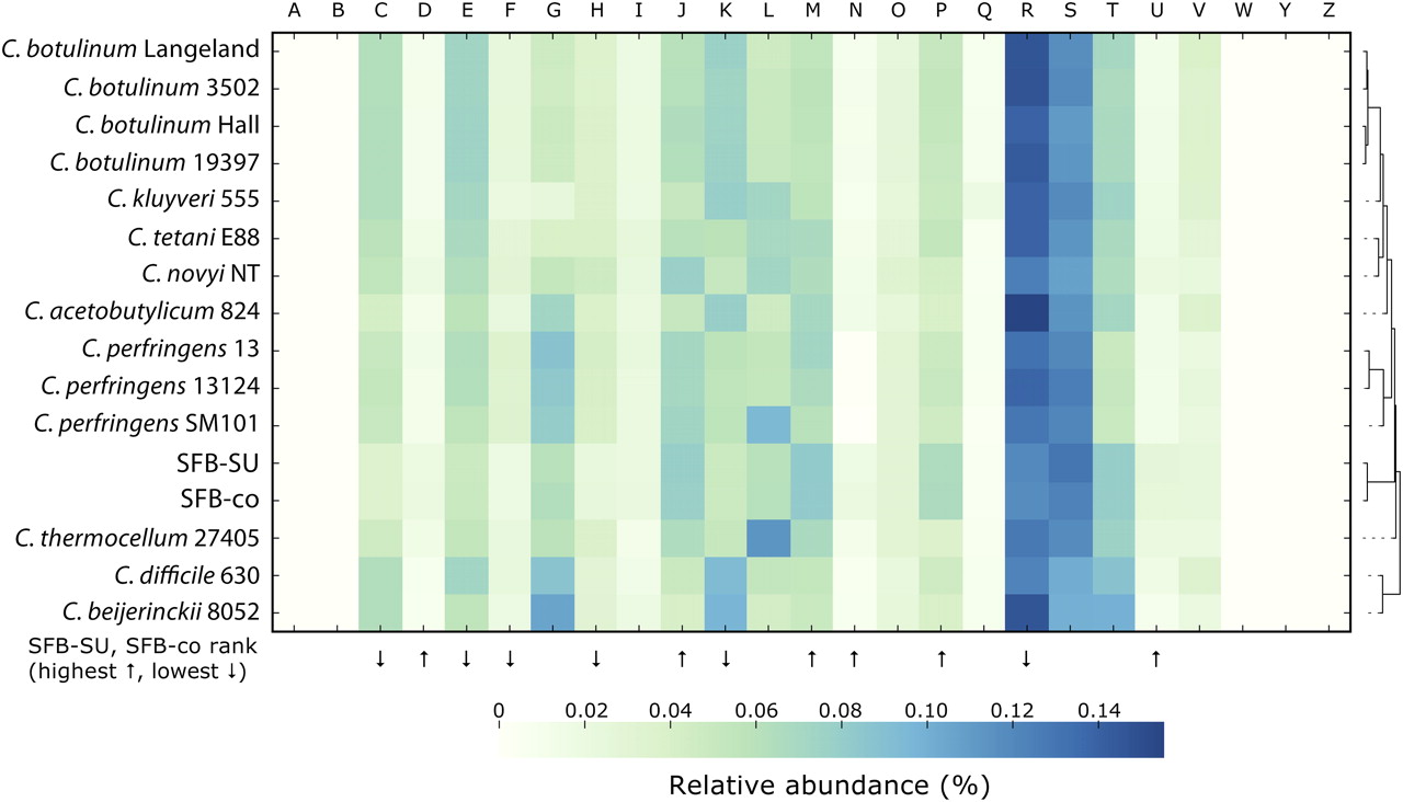 Functional categories of cluster orthologous groups (COGs). Analysis of the predicted proteome of SFB-co and SFB-mouse-SU in comparison to other clostridia. Relative abundance levels of COG functional categories were clustered using a Euclidean distance metric and displayed as a heatmap, with low abundance (light green) and high abundance (dark blue). (A) RNA processing and modification. (B) Chromatin structure and dynamics. (C) Energy production and conversion. (D) Cell cycle control, cell division, chromosome partitioning. (E) Amino acid transport and metabolism. (F) Nucleotide transport and metabolism. (G) Carbohydrate transport and metabolism. (H) Coenzyme transport and metabolism. (I) Lipid transport and metabolism. (J) Translation, ribosomal structure and biogenesis. (K) Transcription. (L) Replication, recombination and repair. (M) Cell wall/membrane/envelope biogenesis. (N) Cell motility. (O) Post-translational modification, protein turnover, chaperones. (P) Inorganic ion transport and metabolism. (Q) Secondary metabolites biosynthesis, transport, and catabolism. (R) General function prediction only. (S) Function unknown. (T) Signal transduction mechanisms. (U) Intracellular trafficking, secretion, vesicular transport. (V) Defense mechanisms. (W) Extracellular structures. (Y) Nuclear structure. (Z) Cytoskeleton.