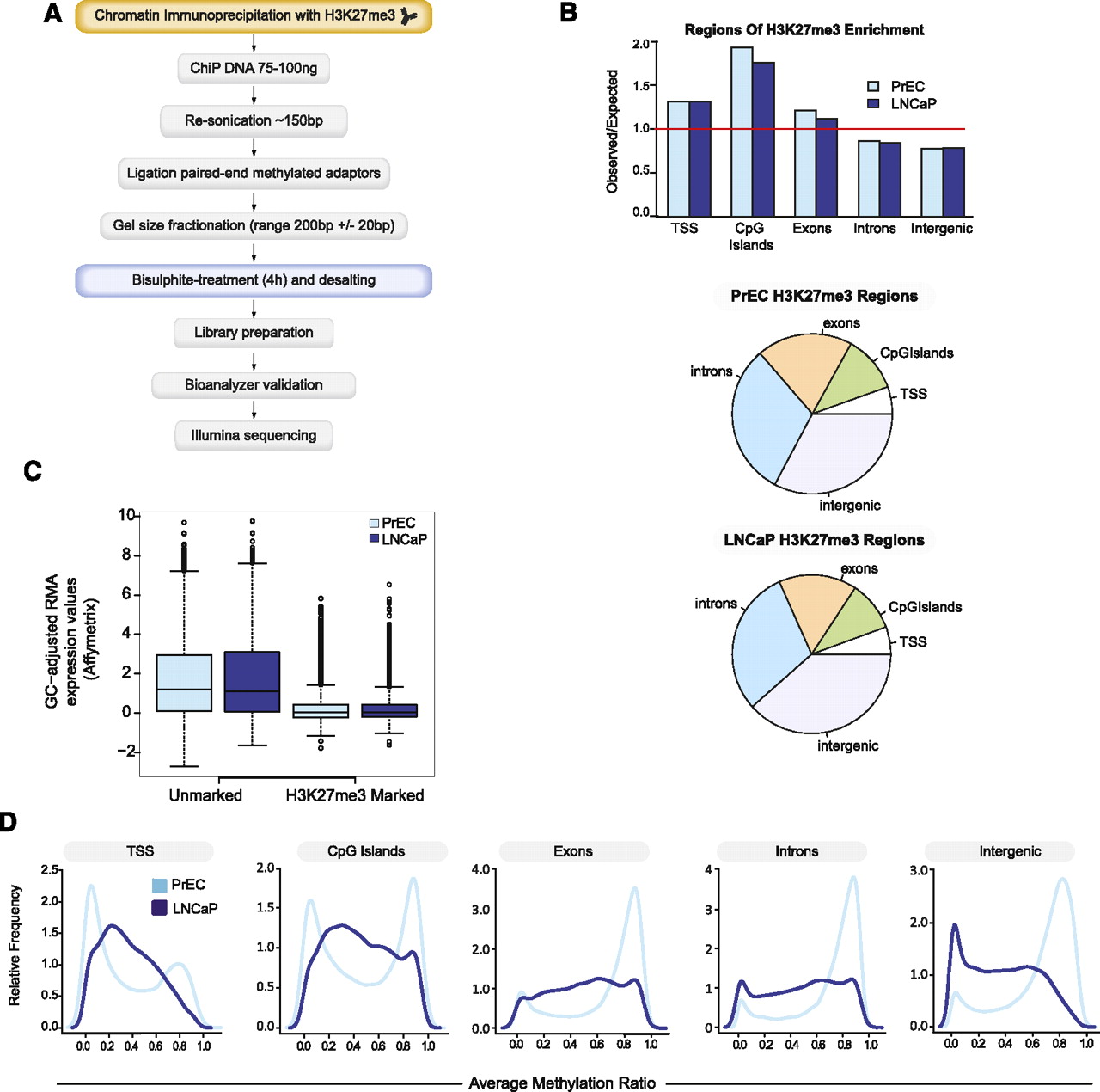 BisChIP-seq DNA methylation profiles of H3K27me3-enriched DNA from normal PrEC and cancer LNCaP cells. (A) Flowchart of BisChIP-seq protocol to perform bisulfite treatment and library preparation on H3K27me3-ChIP DNA. (B) Distribution of H3K27me3-enrichment genome-wide relative to observed over expected and pie charts showing relative distributions across the genome. (C) Affymetrix Gene 1.0 ST expression values for H3K27me3-marked and -unmarked genes in PrEC and LNCaP cells. (D) Distribution frequency of CpG methylation levels at H3K27me3-marked regions that fall into each regional annotation category from low (0%) to high (100%) methylation (0.0–1.0).