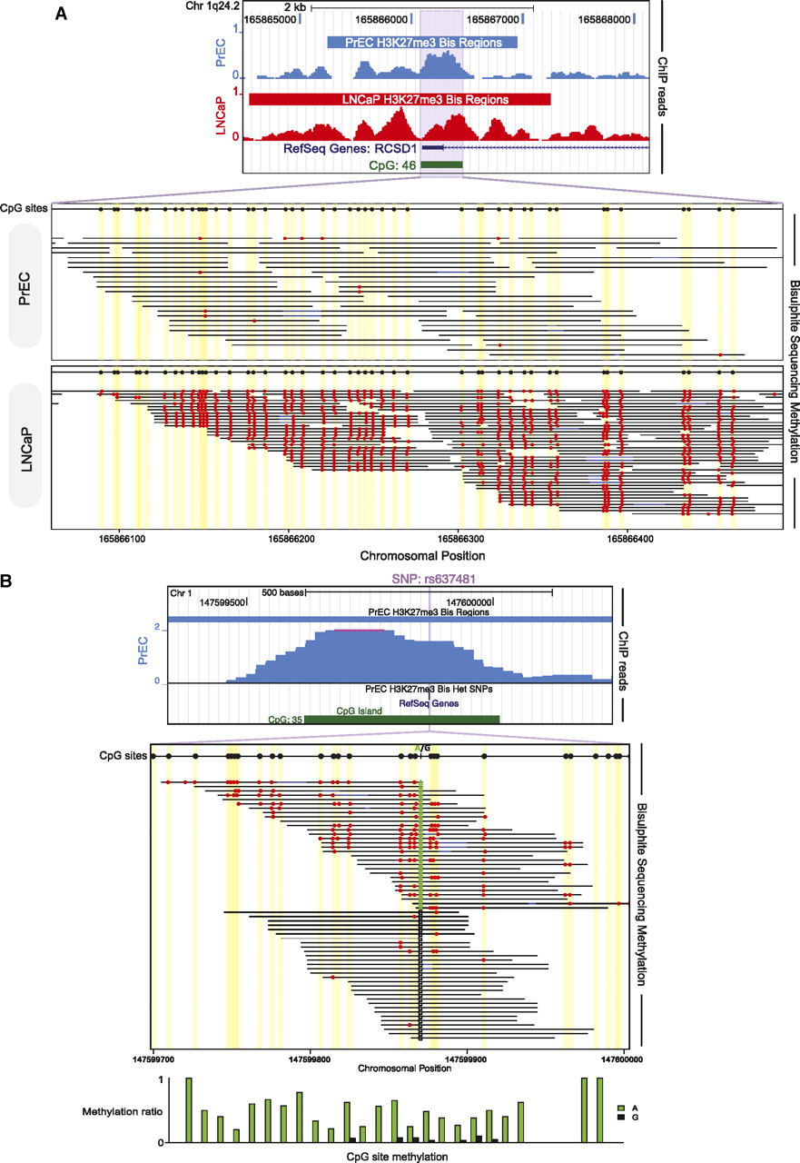 BisChIP-seq examples showing differential methylation and allele-specific methylation in H3K27me3-enriched ChIP DNA. (A) UCSC Genome Browser screen shot of BisChIP-seq data showing the RCSD1 TSS and CpG island, where H3K27me3-modified histones are enriched in both PrEC and LNCaP. (Purple shading) In PrEC cells the CpG island is unmethylated, whereas in LNCaP cells the island becomes extensively DNA methylated without losing the H3K27me3 mark. Individual bisulfite methylation sequencing reads are shown with CpG sites (black circles) in yellow shading for each molecule. (Red circles) CpG DNA methylation. (B) Example of allele-specific methylation in PrEC cells at rs637481 on chromosome 1. UCSC Genome Browser screen shot of BisChIP-seq data indicates regions of significant H3K27me3-enrichment called by ChromaBlocks. (Purple line) Position of the A/G SNP at rs637481. Individual bisulfite molecule sequencing reads are shown with all CpG sites in the sequence (black circles) in yellow shading for each molecule. (Red circles) BisChIP-seq readout of CpG DNA methylation. The allele-specific methylation ratio is indicated by bar graphs.