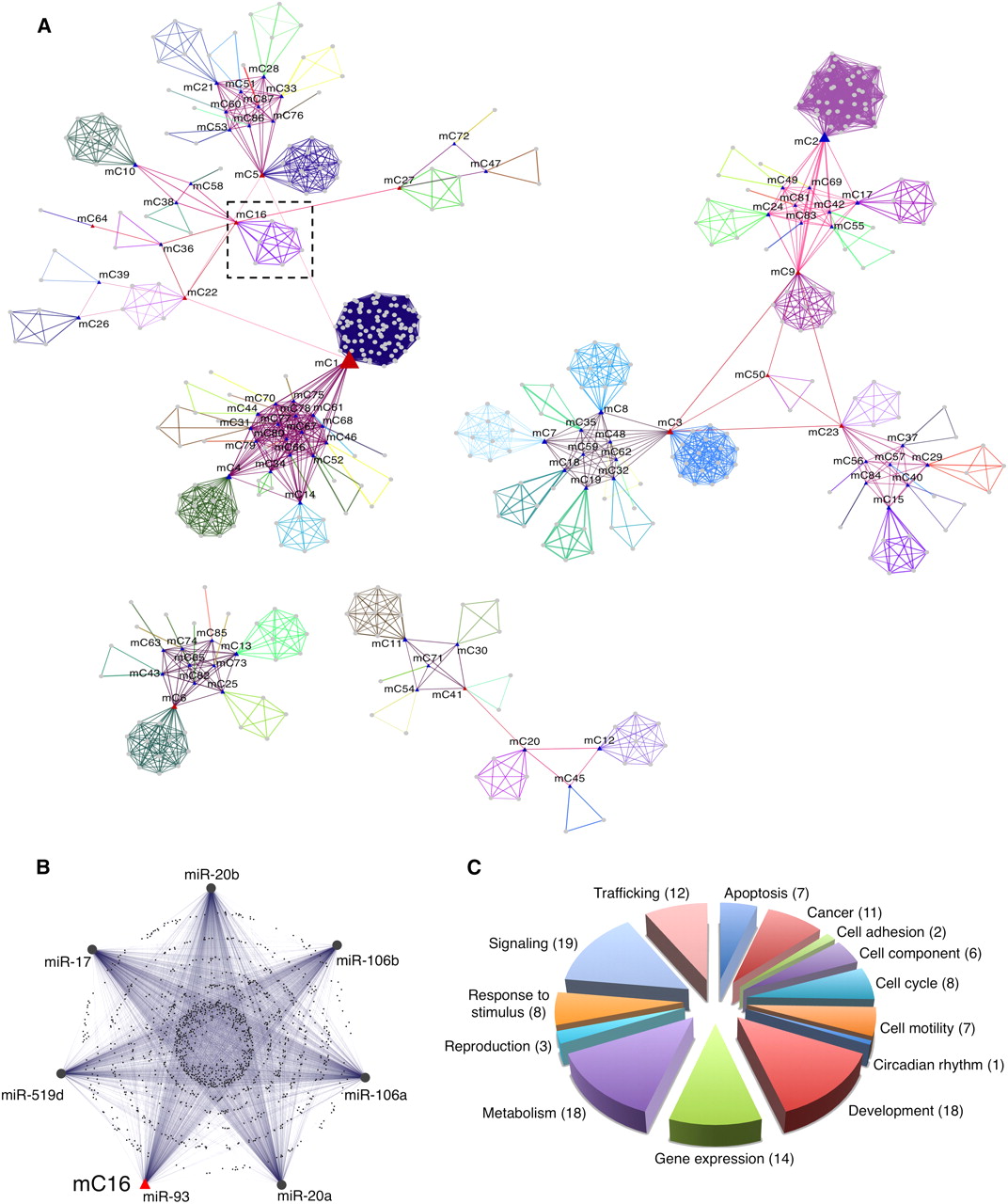 miRNA community networks. (A) Graphical representation of the community organization of human miRNA downstream transcriptional networks. (Gray circles) miRNAs. miRNAs that belong to the same community are linked with edges of the same color. For each community an exemplar (center of the miRNA community) was chosen and is indicated with a blue triangle. (Red triangle) miRNAs that link together different communities. (B) Enlarged section from A, showing the composition of miRCo16 and the mutual relationships of its miRNAs and shared target genes. (C) Frequency distribution of functions assigned to miRCOs as grouped in macrocategories. The number of miRCOs associated with each macrocategory is shown in parenthesis.