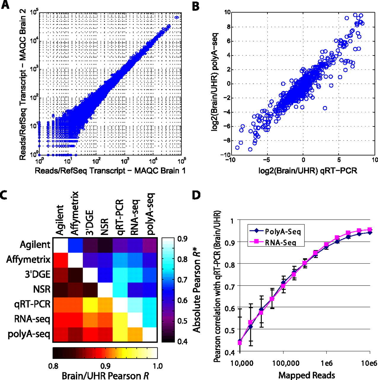 PolyA-seq DGE. (A) DGE correlation of MAQC Human Brain technical replicates independently processed from total RNA (Pearson r = 0.994). (B) DGE correlation of PolyA-seq with MAQC qRT–PCR for Brain/UHR ratio (r = 0.948). (C) Correlation values among commonly used expression technologies applied to MAQC (Shi et al. 2006) samples. Bottom, left of diagonal are correlations based on Brain/UHR ratios; top, right are correlations based on the absolute expression values (average r of brain vs. brain and UHR vs. UHR). All comparison data are published: qRT–PCR (Shi et al. 2006), Agilent (Shi et al. 2006) and Affymetrix (Shi et al. 2006) microarray data, RNA-seq (Bullard et al. 2010), 3′DGE (Asmann et al. 2009), NSR (Armour et al. 2009). (D) Pearson correlations of Brain/UHR qRT–PCR improve with increasing numbers of mapped reads for PolyA-seq and RNA-seq. Values represent the average from 100 random sampling iterations and error bars indicate standard deviation. See Methods for further details on processing of expression data.