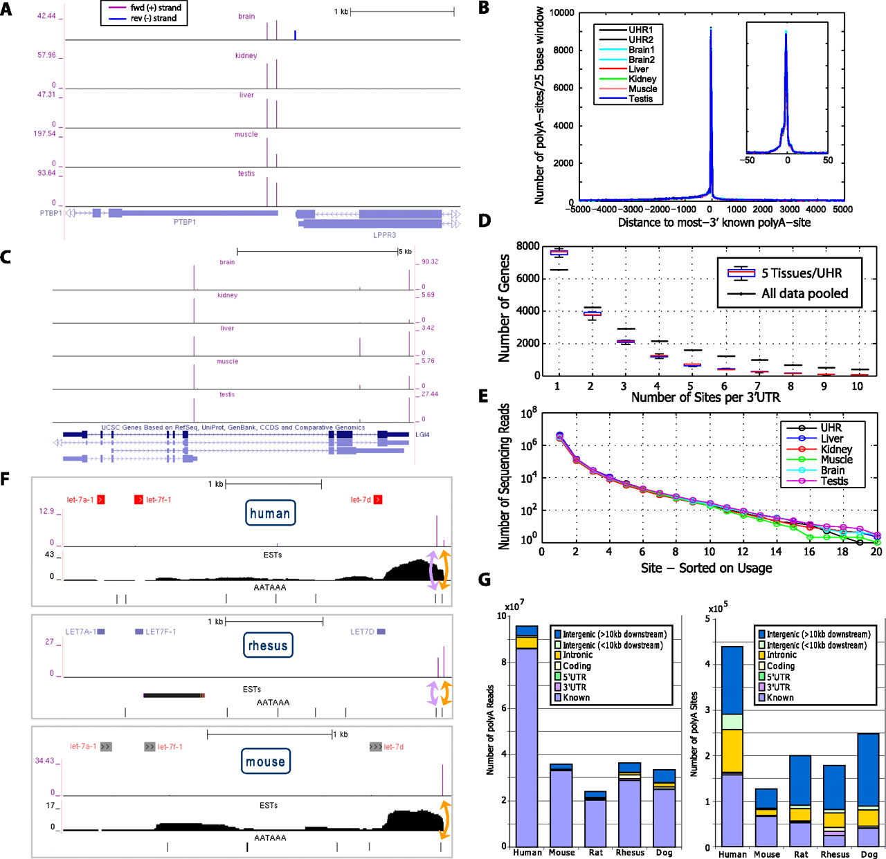 Assessment of basic features of the PolyA-seq atlas. (A) PolyA-seq detects polyA sites in a strand-specific manner. Two polyA sites (vertical spikes) are detected in human splicing factor PTBP1 (forward genomic strand, indicated by arrows) in all tissues, while LPPR3 (reverse strand) has a single polyA site, detected only in brain. Y-axis units are reads per million (see Methods; note that y-axis scales vary among tissues). PolyA-seq sites on the forward and reverse genomic strands are shown in different colors. (B) Human sites agree to single-base precision with known transcript termini. Known termini represent the 3′-most site reported by RefSeq, UCSC KG, or Ensembl per gene. (C) PolyA-seq reveals constitutive and tissue-dependent polyA sites. In human LGI4, polyA site choice is governed by alternative splicing. The 5′-most site is used in all tissues even as absolute expression levels fluctuate (see A for details). The intermediate site is used primarily in liver, while the downstream site is repressed in kidney, but is otherwise expressed at levels similar to the upstream site. (D) Number of polyA sites/3′UTR in five human tissues and UHR (navg/tissue = 16,387, ntotal uniq = 20,873; see Methods for 3′UTR compilation). All samples were normalized to equal numbers of aligned sequencing reads by random selection. (Black lines) Sites/3′UTR for aggregated data from these six samples. (E) Number of sequencing reads/site; sites were selected based on decreasing order of usage per 3′UTR. (F) Lineage-dependent polyadenylation of a pri-microRNA transcript. PolyA-seq detects polyadenylation downstream from the microRNA cluster containing let7a1, let7f1, and let7d in all tissues assayed in all species (data not shown, but see Supplemental Fig. 8 for additional details; for simplicity, PolyA-seq data and polyA signals are shown here only for human, rhesus, and mouse kidney, and only for the sense strand; arrows within microRNA precursors indicate the direction of transcription). In human and rhesus, two polyA sites (purple spikes) correspond to two canonical polyA signals (AATAAA; black tick marks), the first of which is present only in primate genomes (data not shown). In rat, mouse, and dog, only the downstream polyA site is detected, in accordance with the absence of the upstream polyA signal. (G) Distribution of reads and polyA sites across genomic features. All reads were aggregated in each species and then filtered and clustered as described in the main text.