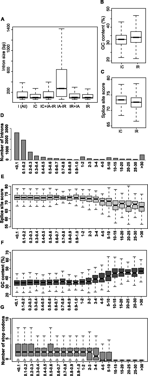 Features of retained introns. (A) Size distribution of different intron classes. [I(All)] All introns in our sample, (IC) the constitutive introns, (IC+IA−IR) and (IA−IR) the categories without retained introns either including or excluding constitutive introns, respectively, (IR+IA) retained introns that are also involved in other AS events, (IR) introns that are only retained. (B) GC content distribution of constitutive introns (IC) and retained introns (IR). (C) Splice site score distribution of constitutive introns (IC) and retained introns (IR). (D) Histogram of number of introns in each intron retention ratio (IRR) category. (E) Boxplots of splice site score distribution by IRR category. (F) Boxplots of GC content distribution by IRR category. (G) Boxplots of stop codons distribution by IRR category. For the splice site score distributions in C and E, the means of 5′ and 3′ splice sites scores (calculated according to Sheth et al. 2006) were used.