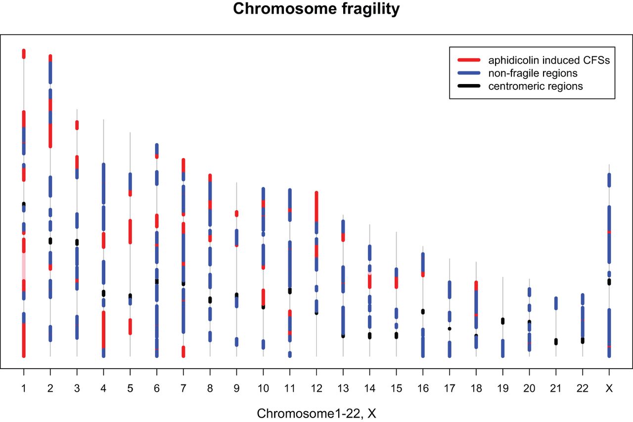 Locations of 76 APH-induced common fragile sites (aCFSs) and 124 nonfragile control regions (NFRs) used in this study. (Red) aCFSs (pink is used to differentiate among three fragile sites on chromosome 1). (Blue) NFRs. Gray regions were excluded from the analysis because they are either rare fragile sites or background breakage regions. (Black regions) Centromeres.